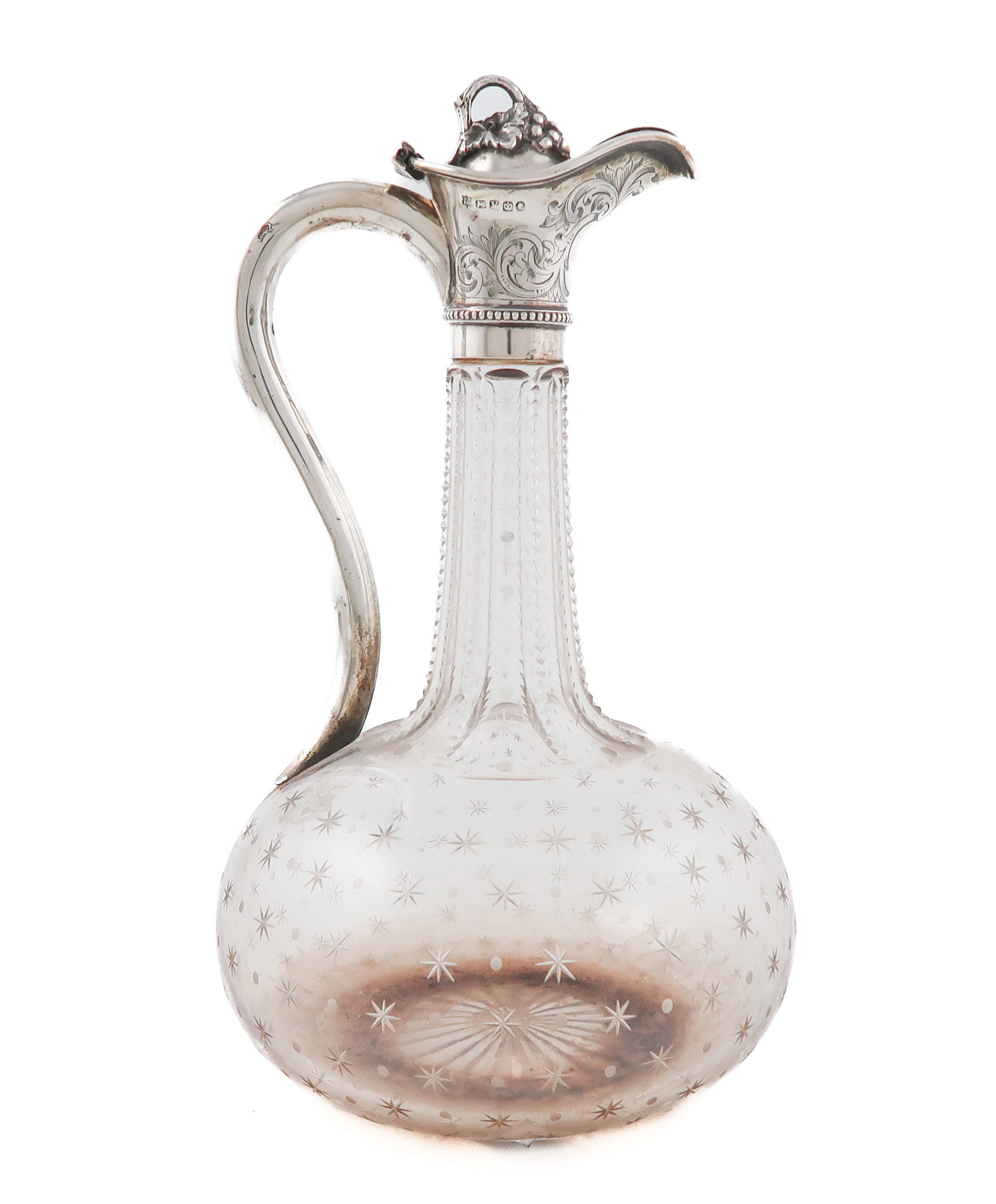 the mounts with engraved scroll foliate decoration and beaded border, scroll handle, a hinged cover with a grape and vine finial, slender neck and circular body with engraved decoration, height 25cm.