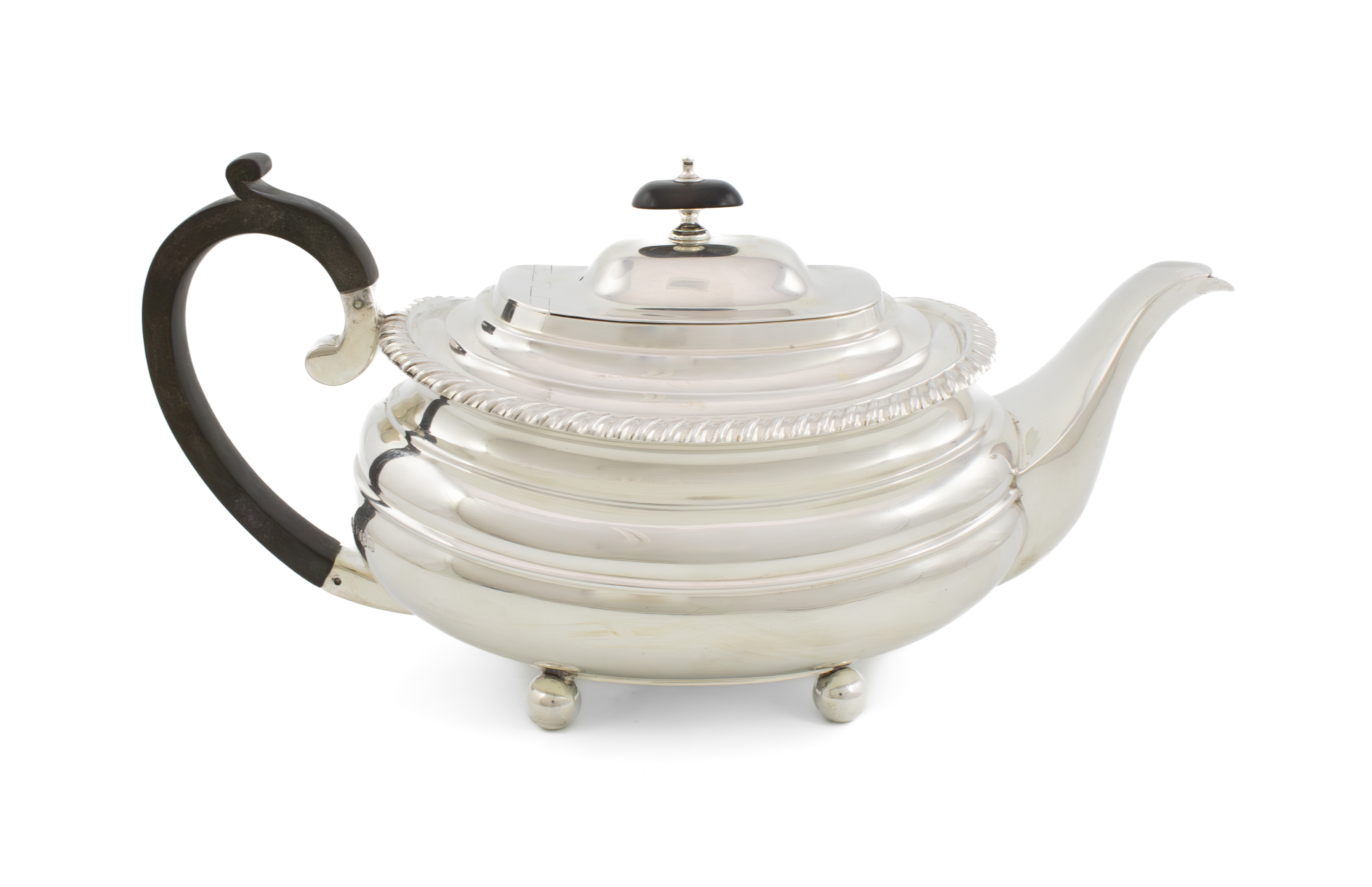 oblong bellied form, gadroon border, raised hinged cover, scroll handle and knop finial, on four ball feet, length handle to spout 28.8cm, approx. weight 23.7oz.