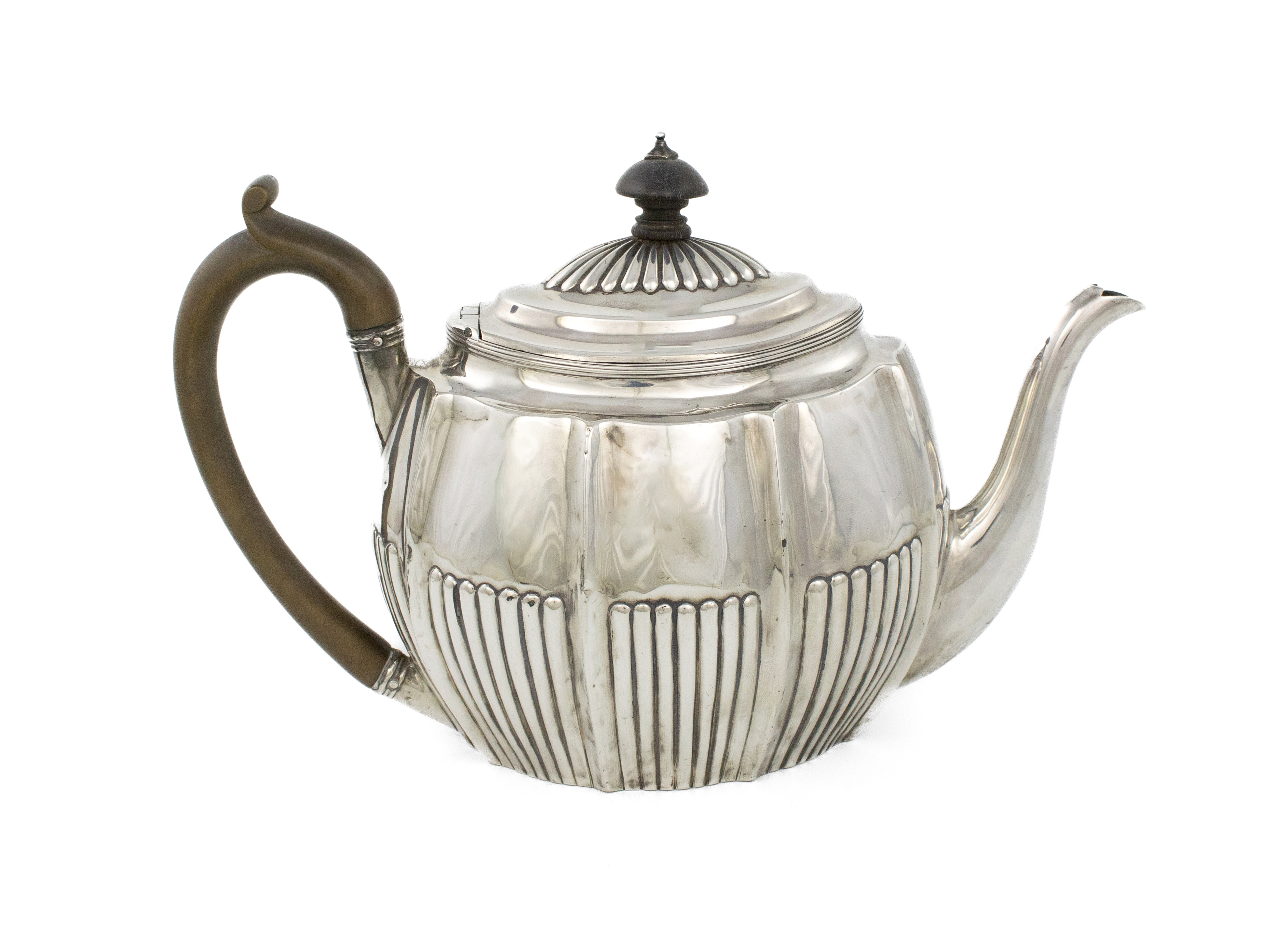 oval lobed and fluted form, scroll handle, length handle to spout 26.5cm, approx. weight 13oz.