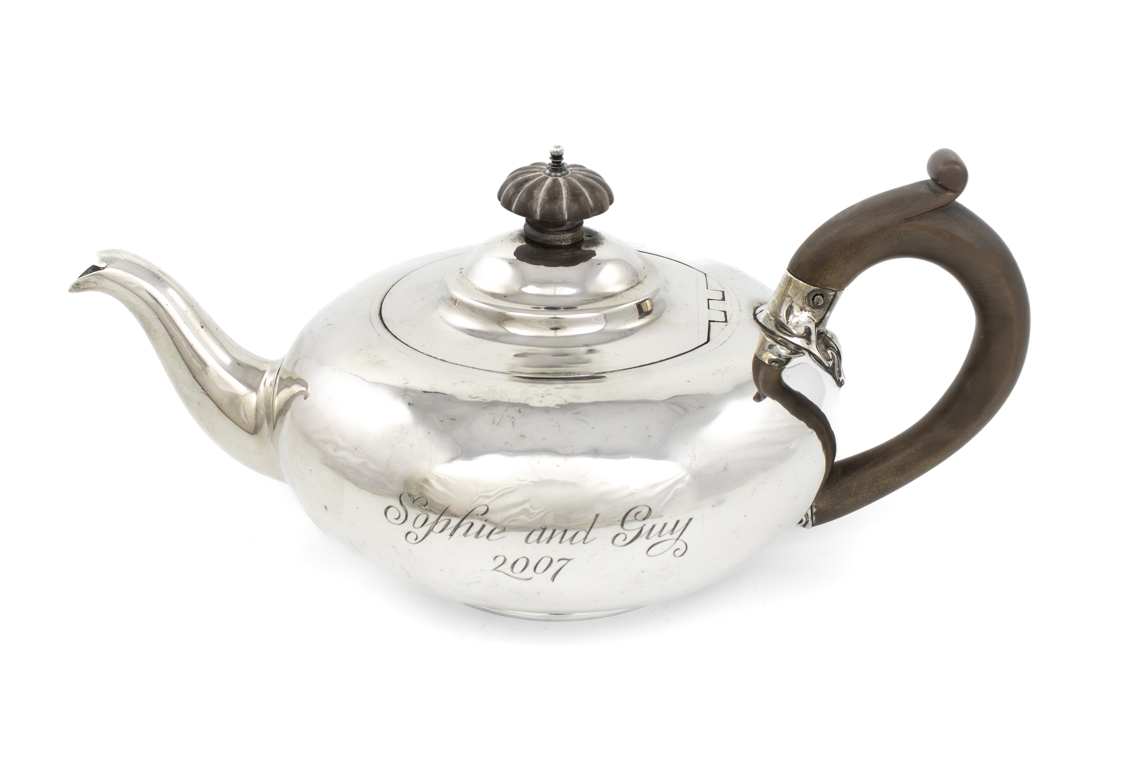 compressed circular form, wooden scroll handle and finial, with initials and also with a later inscription, length handle to spout 25cm, approx. weight 14oz.