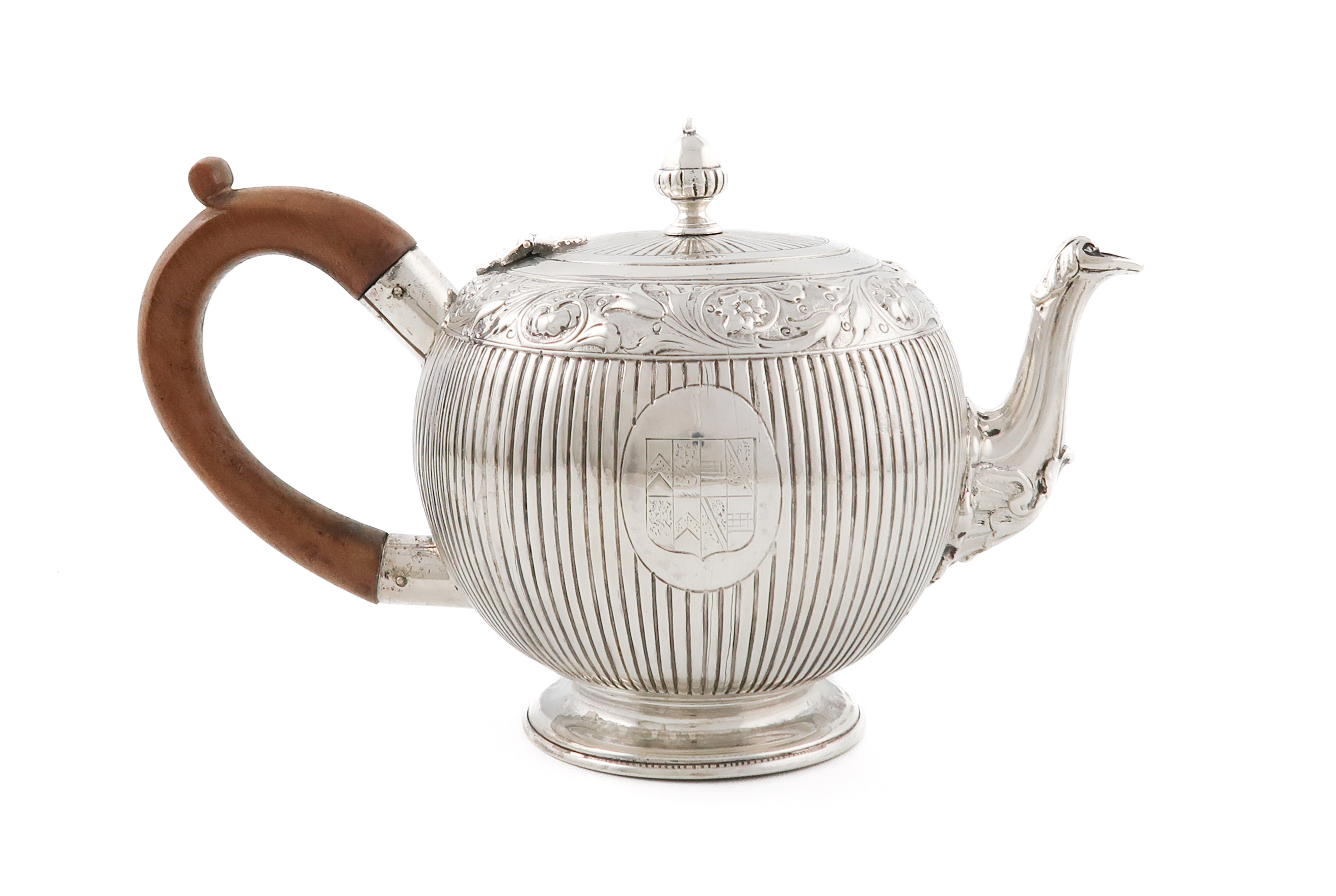 fluted bullet form, a band of scroll foliate decoration, flush hinged cover with acorn finial, two cartouches one engraved with an armorial the other engraved with two crests and a motto, scroll wooden handle, on a circular foot, length handle to spout 22cm, approx. weight 16.5oz.
