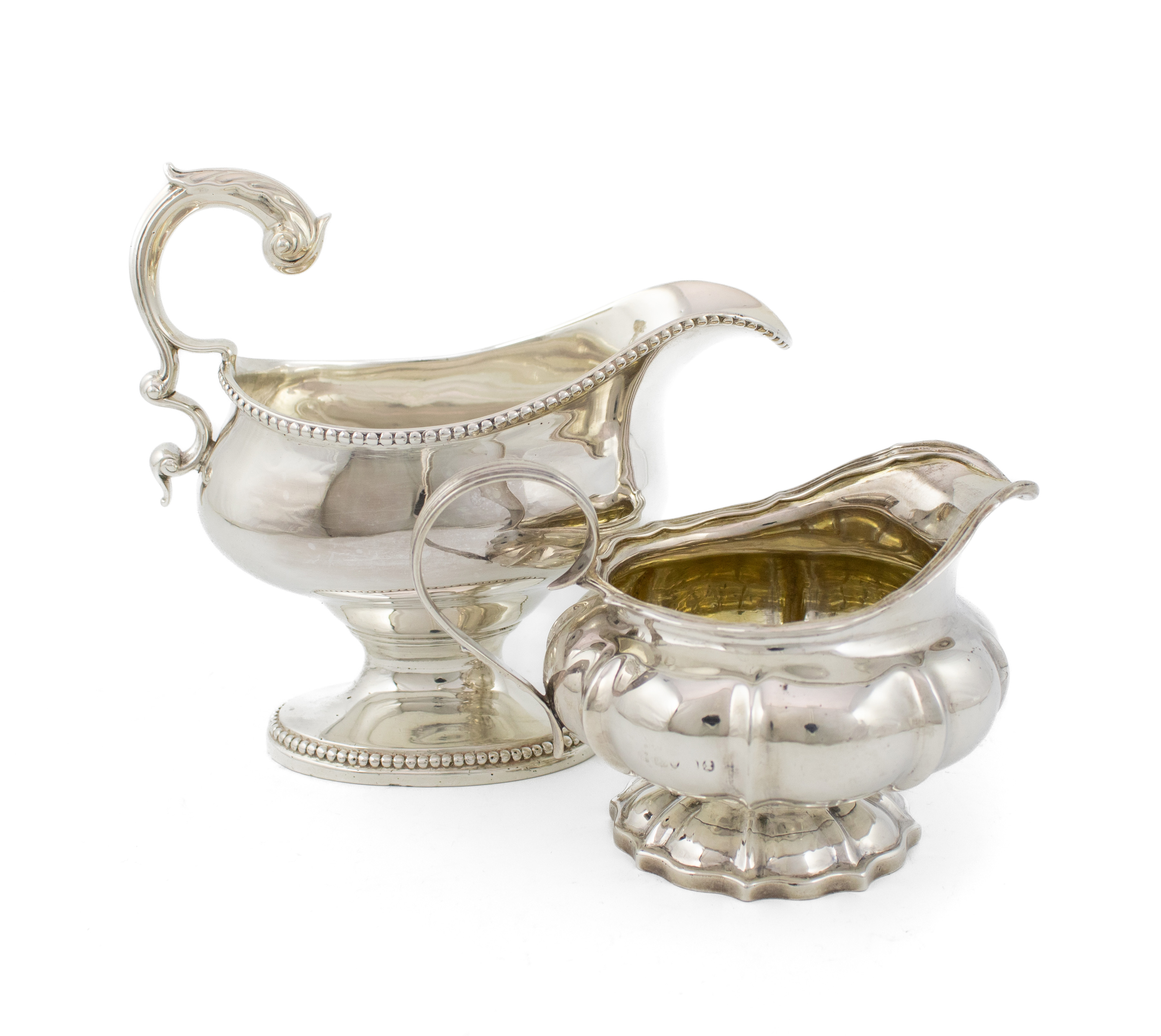 oval form, beaded border, scroll handle, on a raised oval base, plus a George III silver cream jug by Rebecca Emes and Edward Barnard, London circa 1810, lobed circular body, reeded rim, scroll handle, gilded interior, on a raised circular shaped base, length handle to spout 17.3cm, total approx. weight 21.1oz. (2)