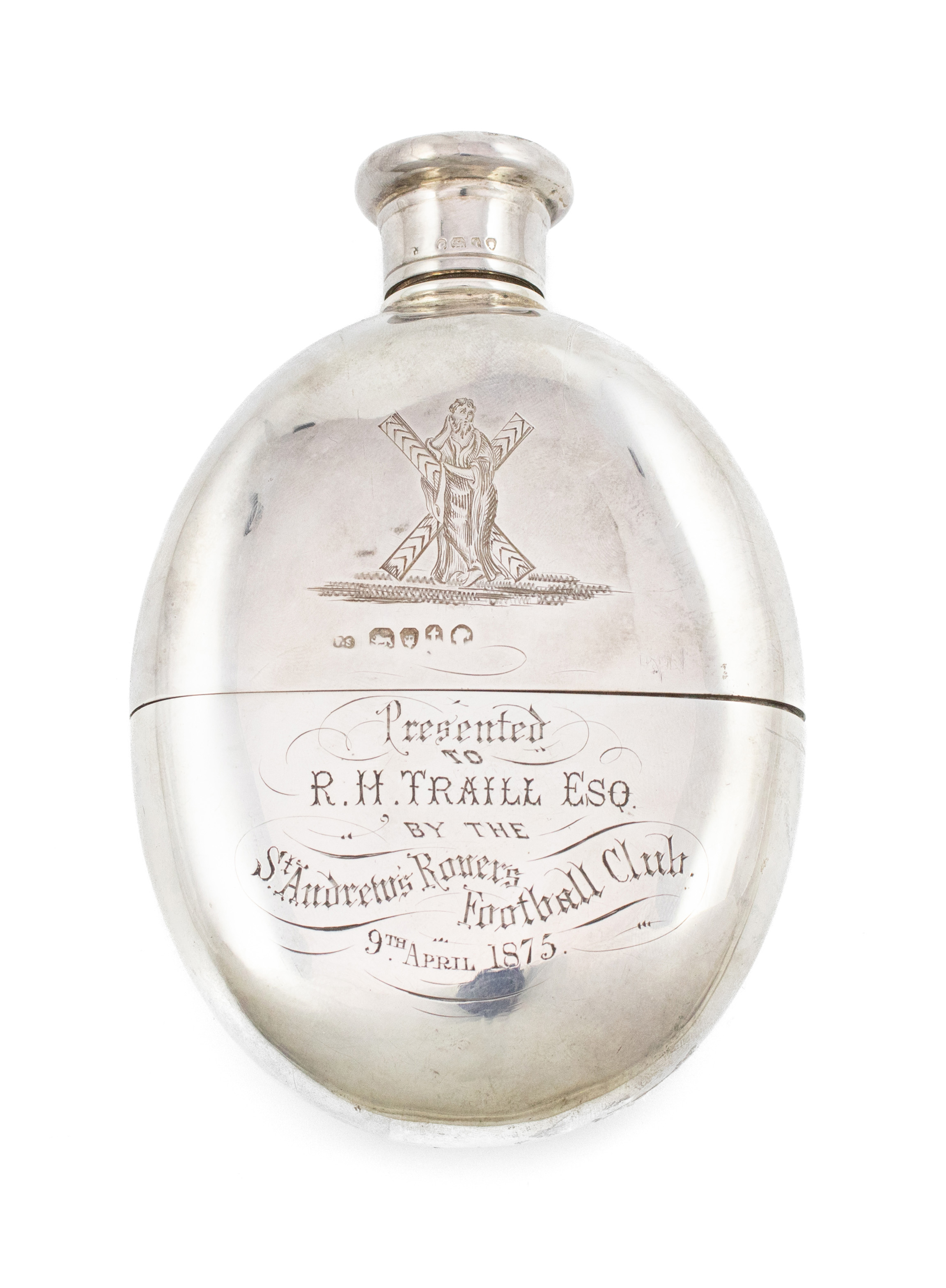 oval form, pull-off drinking cup, screw-off cover, engraved with a motto and crest, a monogram and with an image of St. Andrew with his cross, inscribed 'Presented to R.H. Traill Esq. By The St. Andrews Rovers Football Club, 9th April 1875', length 13.5cm, approx. weight 6.5oz.