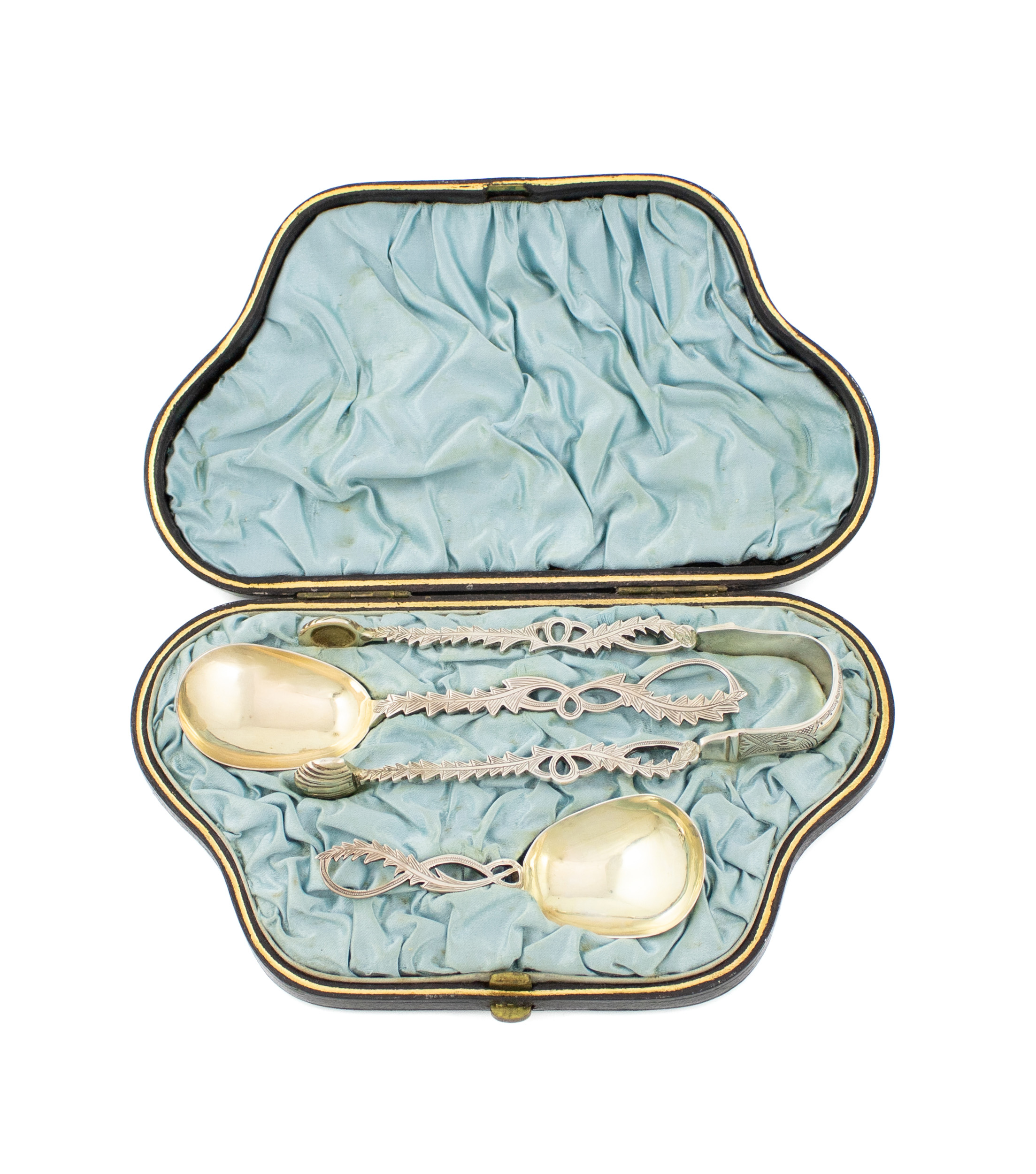 A cased Victorian silver caddy spoon, sugar spoon and tongs,