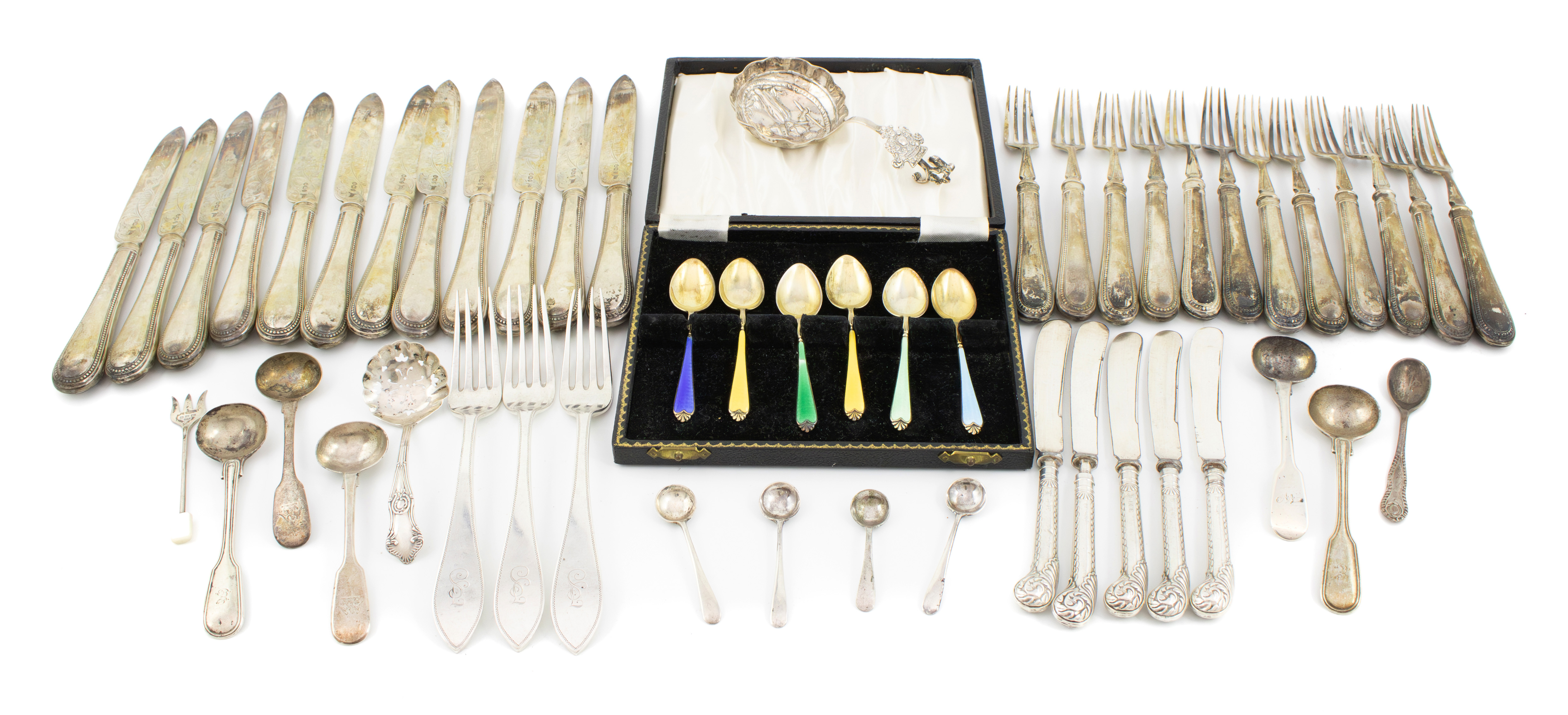 beaded borders to the handles and engraved foliate decoration to the blades, case a.f, plus ten salt spoons, four fruit knives, a cased set of silver-gilt and enamel teaspoons and other items, total approx. weighable 45oz. (qty)
