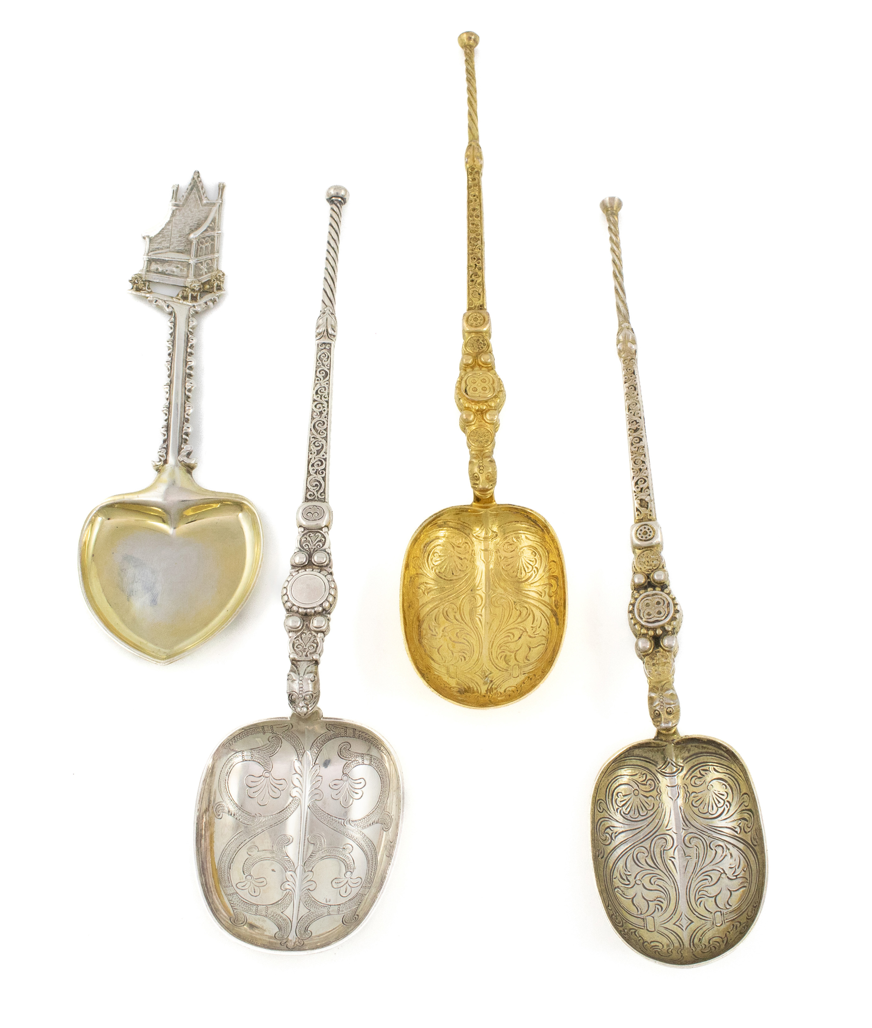 comprising: two Edwardian silver-gilt anointing spoons by Cornelius Sanders & James Shepard, London 1901, a Victorian anointing spoon and a commemorative Edward VII spoon, the terminal modelled as the Coronation throne, total approx. weight 12oz. (4)