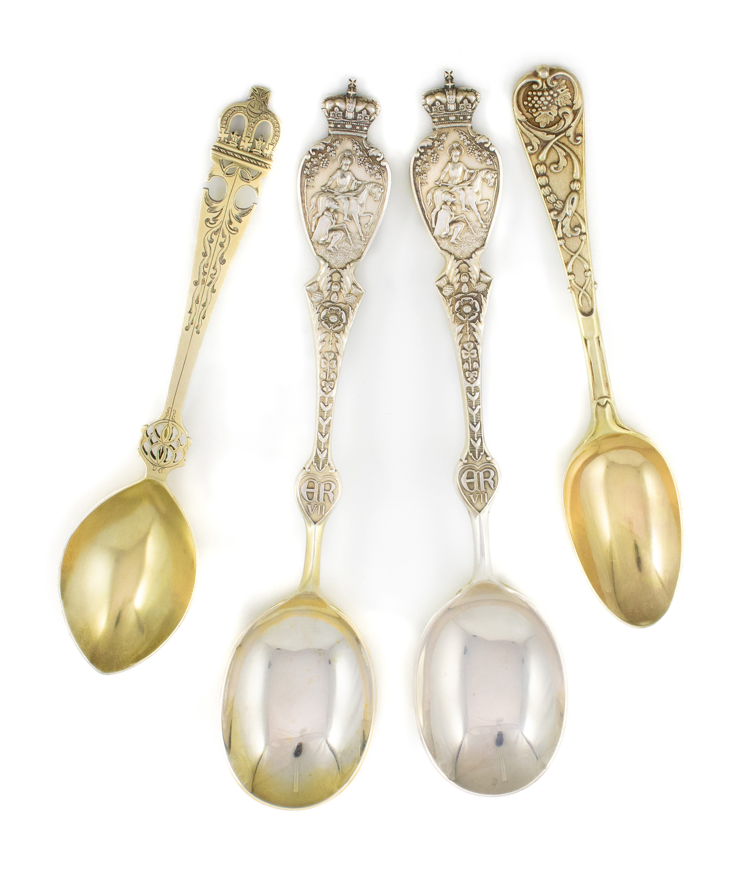 for Vintner's Company commemorating Edward VII's coronation, plus a silver-gilt Victorian ribbon and vine pattern dessert spoon by George Adams, London 1851, and a Victorian silver-gilt commemorative spoon for the birth of Prince George, by Henry Wilkinson & Co, Sheffield 1865, total approx. weight 11.3oz. (4)