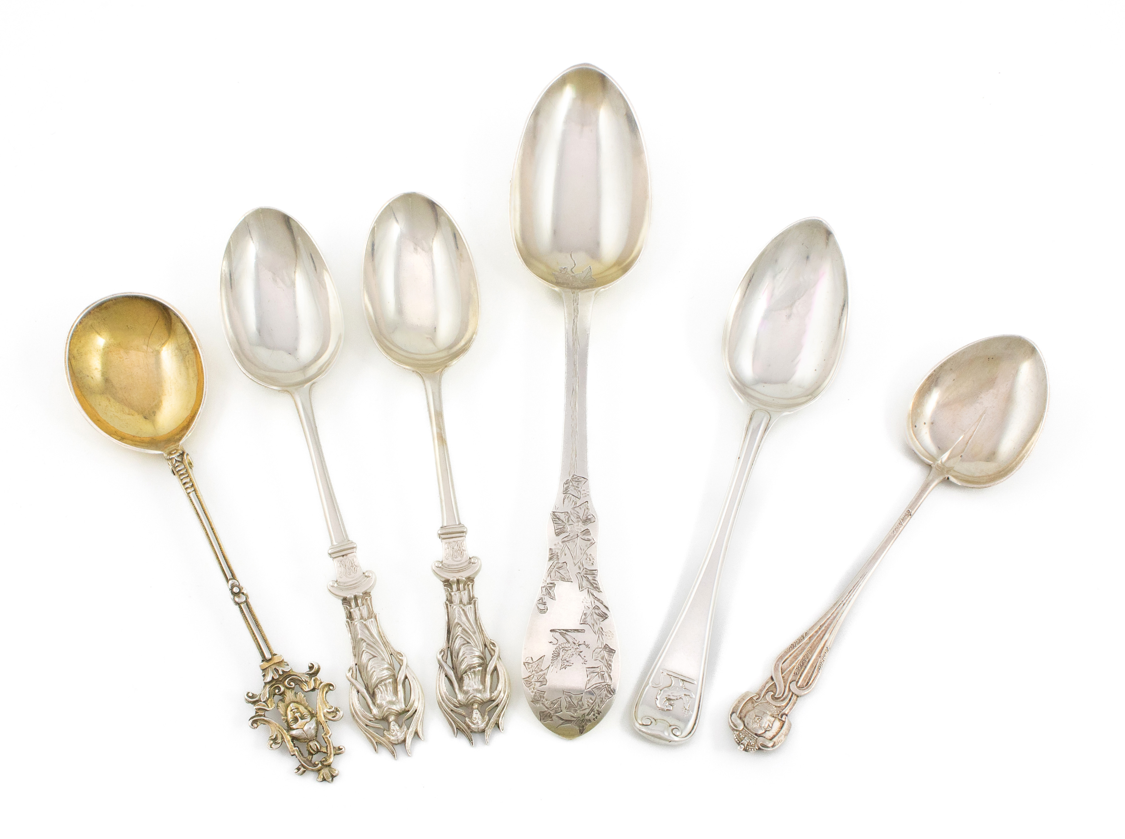 comprising: a Victorian tablespoon with engraved ivy decoration, by George Adams, London 1867, a silver-gilt double stamped mask and scroll spoon by George Adams, London 1863, a matched pair of art nouveau style spoons by R & S Garrard & Co, a commemorative Edward VII spoon and a dessert spoon, total approx. weight 11.2oz. (6)