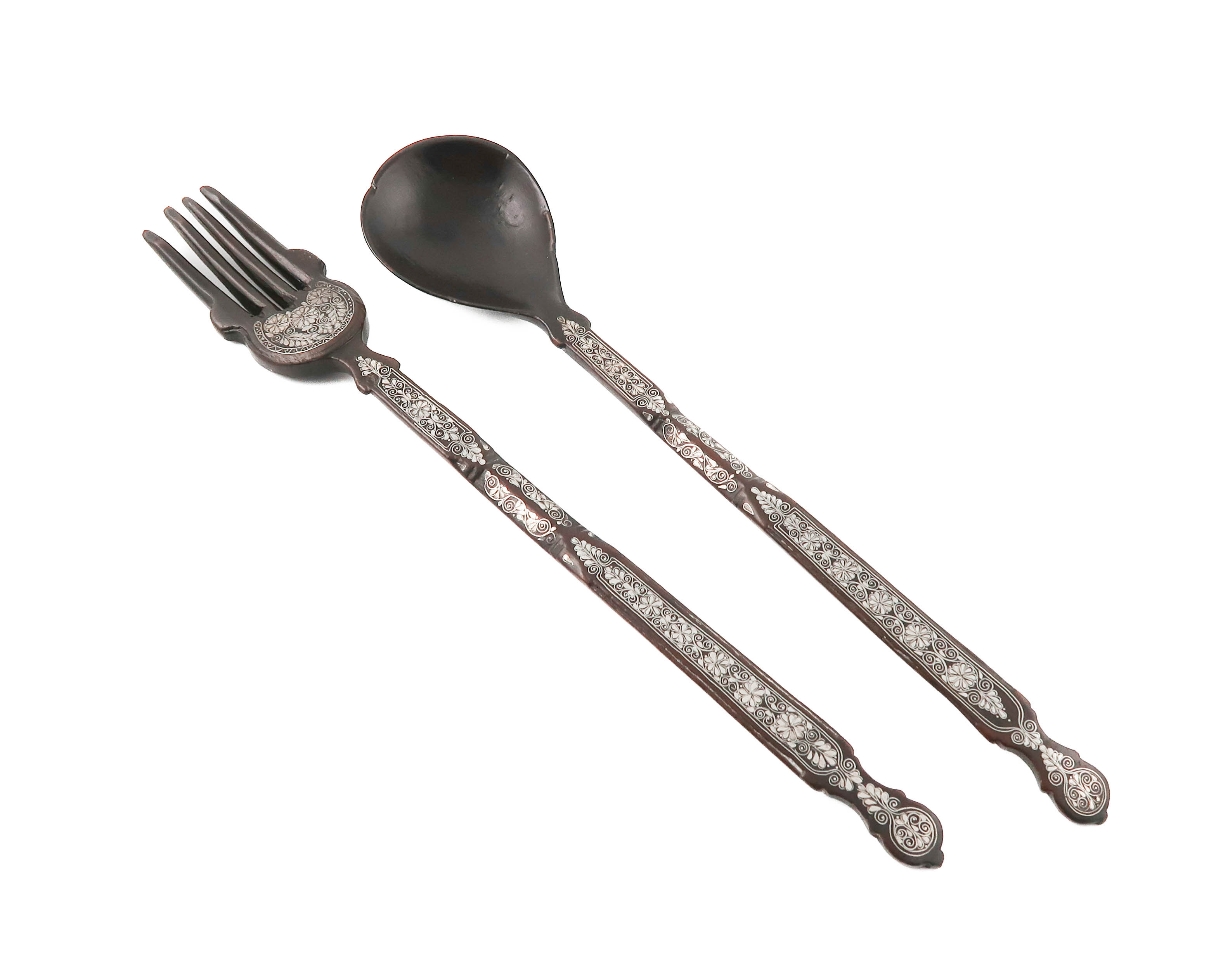 with foliate decoration, four-pronged fork, fig-shaped bowl, length of spoon 25.5cm. (2)
