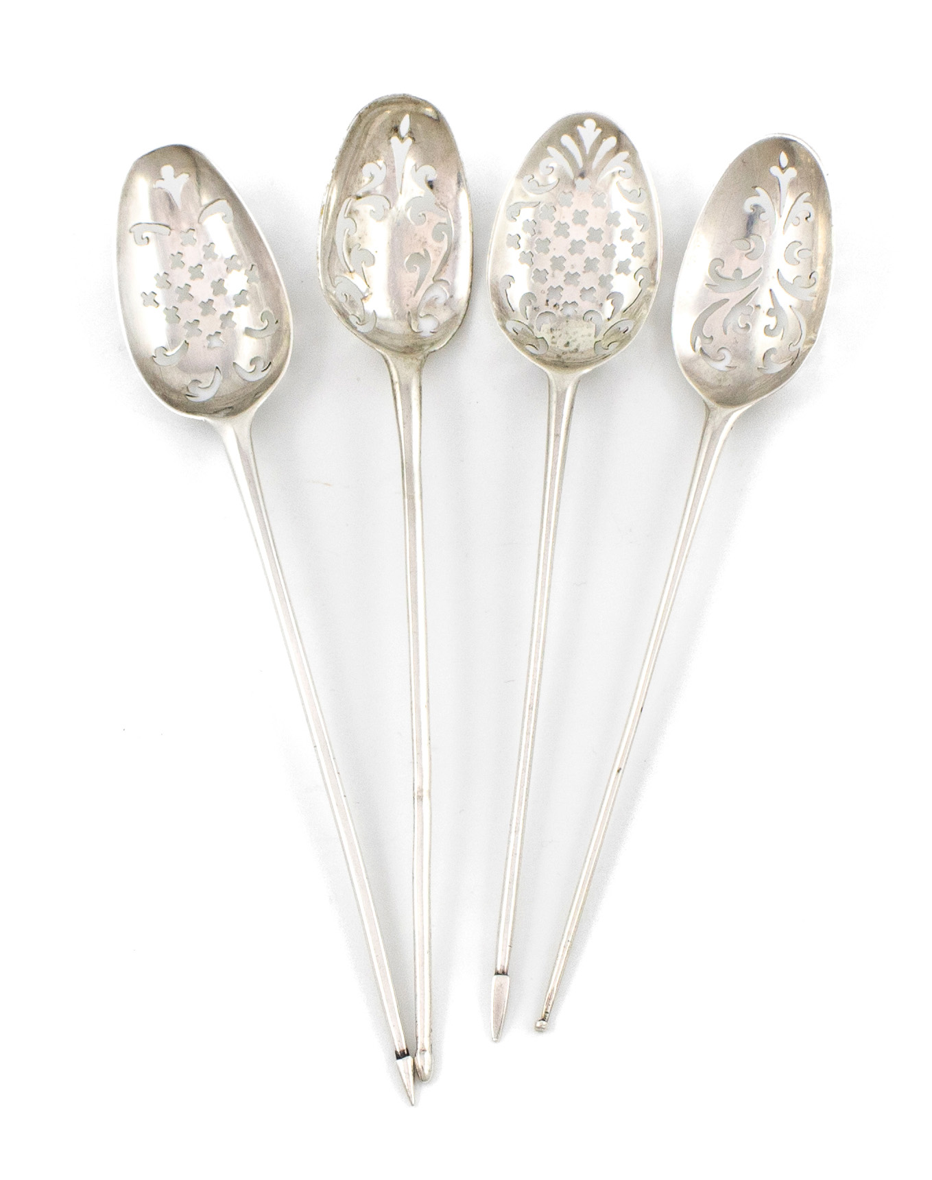 including: one marked possibly 'TM' with a shell heel, one with a scratched 'H' into the heel, two pierced with scroll decoration, total approx. weight 0.9oz. (4)