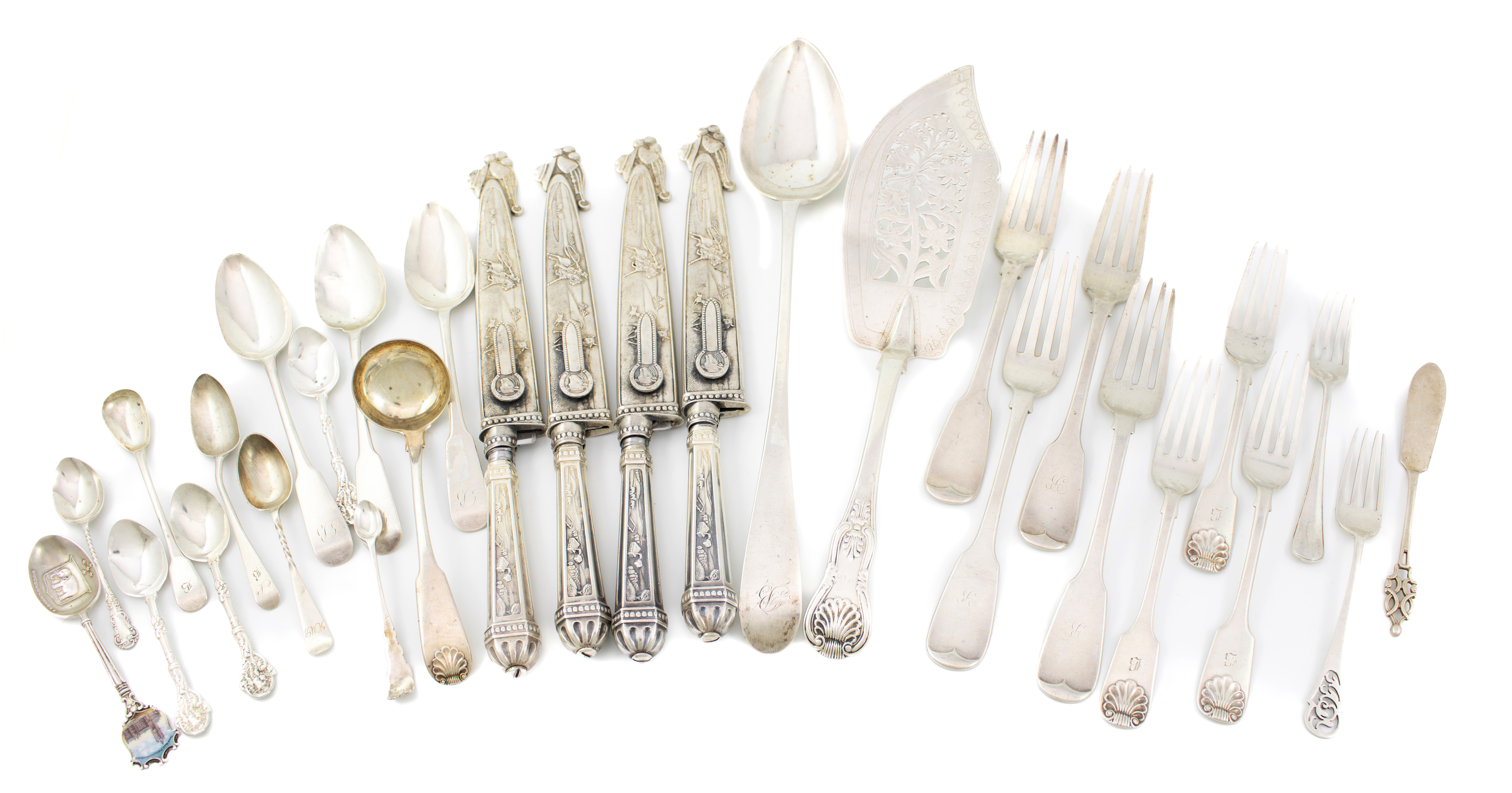 silver items comprising: a Scottish serving spoon, four Scottish table forks, three Scottish dessert spoons, three Scottish dessert forks, fish slice, a set of four silver-plated 'gaucho' knives and other items, total approx. weighable 30.4oz. (28)