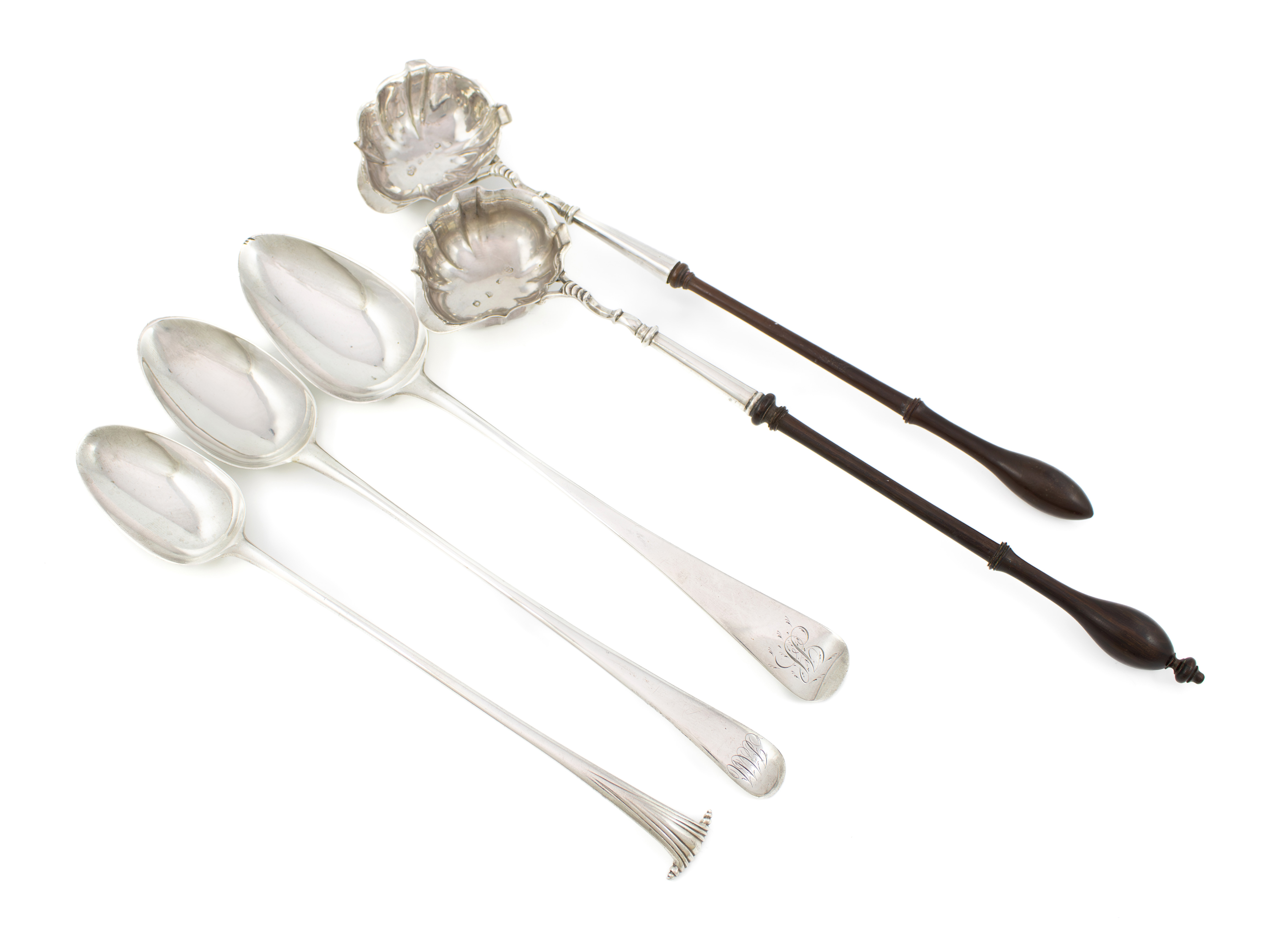 with engraved initials to the terminal, plus an Onslow pattern basting spoon, worn marks, with scratched initials to the underside of the terminal and another basting spoon marked W.F, with engraved initials and two George II silver punch ladles with turned wooden handles, total approx. weighable 9oz. (5)