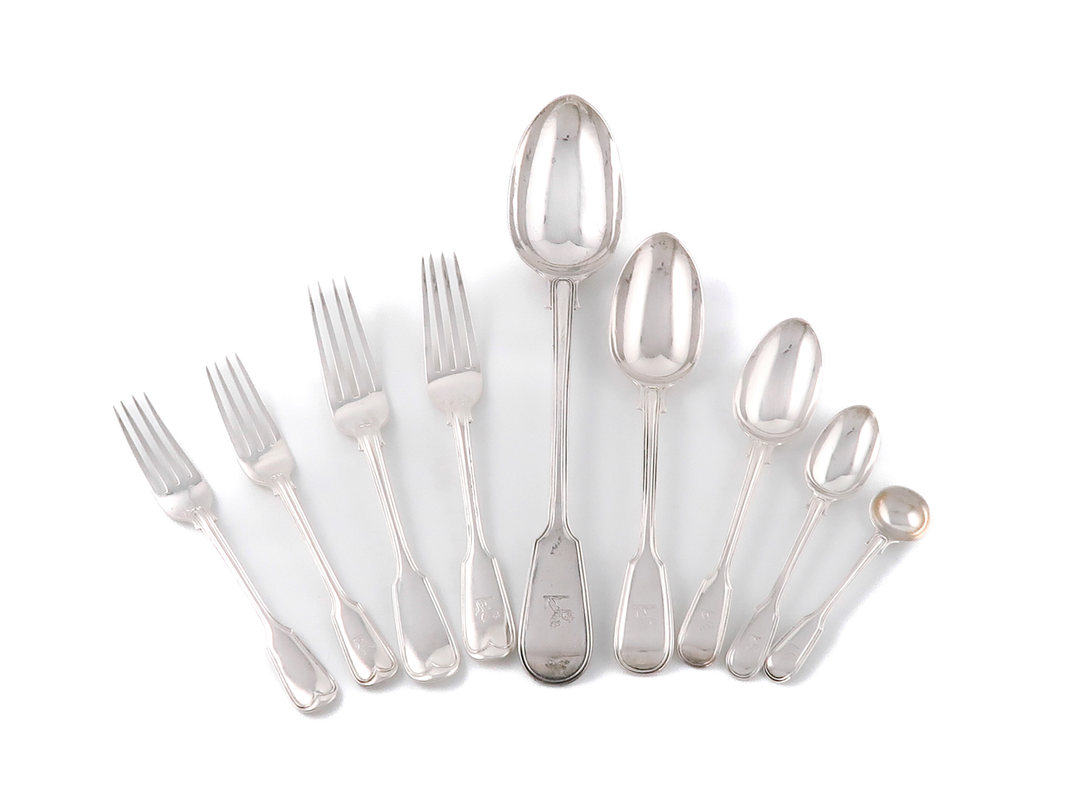 comprising: two serving spoons, sixteen table forks, three tablespoons, three dessert forks, eight teaspoons, by John Hunt & Robert Roskell, London from 1865 to 1874, eight table forks, four dessert forks, four dessert spoons, three teaspoons and two salt spoons by John Samuel Hunt, London 1859, and one tablespoon by George Adams, London 1857, total approx. weight 127.8oz. (54)