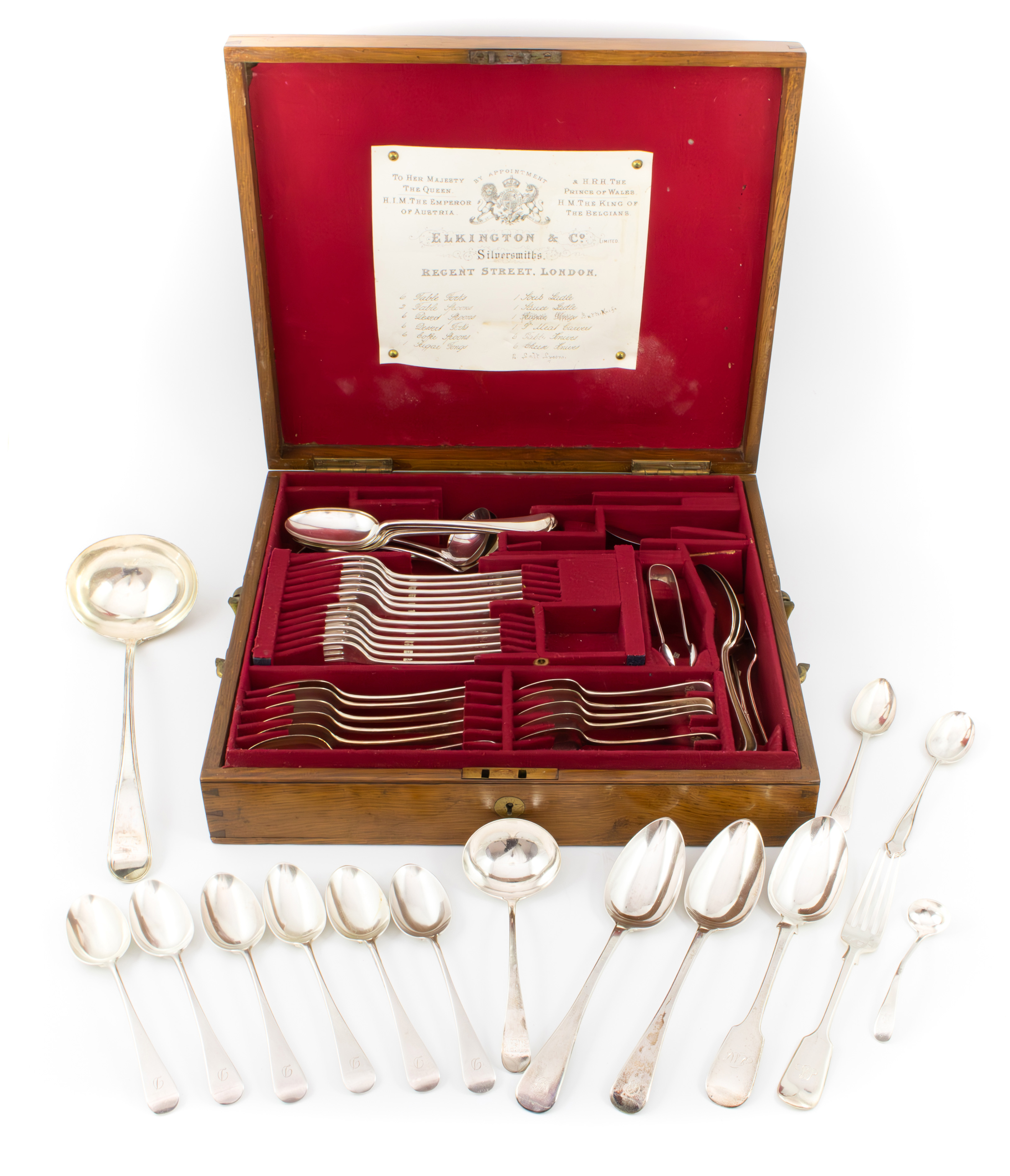 comprising silver items: a George III Thread pattern soup ladle, by William Eley & William Fearn, London 1803, a set of six Old English pattern dessert spoons, two Old English and one Fiddle pattern tablespoons, a sauce ladle, two teaspoons, a condiment ladle and a dessert fork, plus a cased electroplated canteen of Old English pattern flatware, and other electroplated flatware, total approx. weighable 28.2oz. (qty)