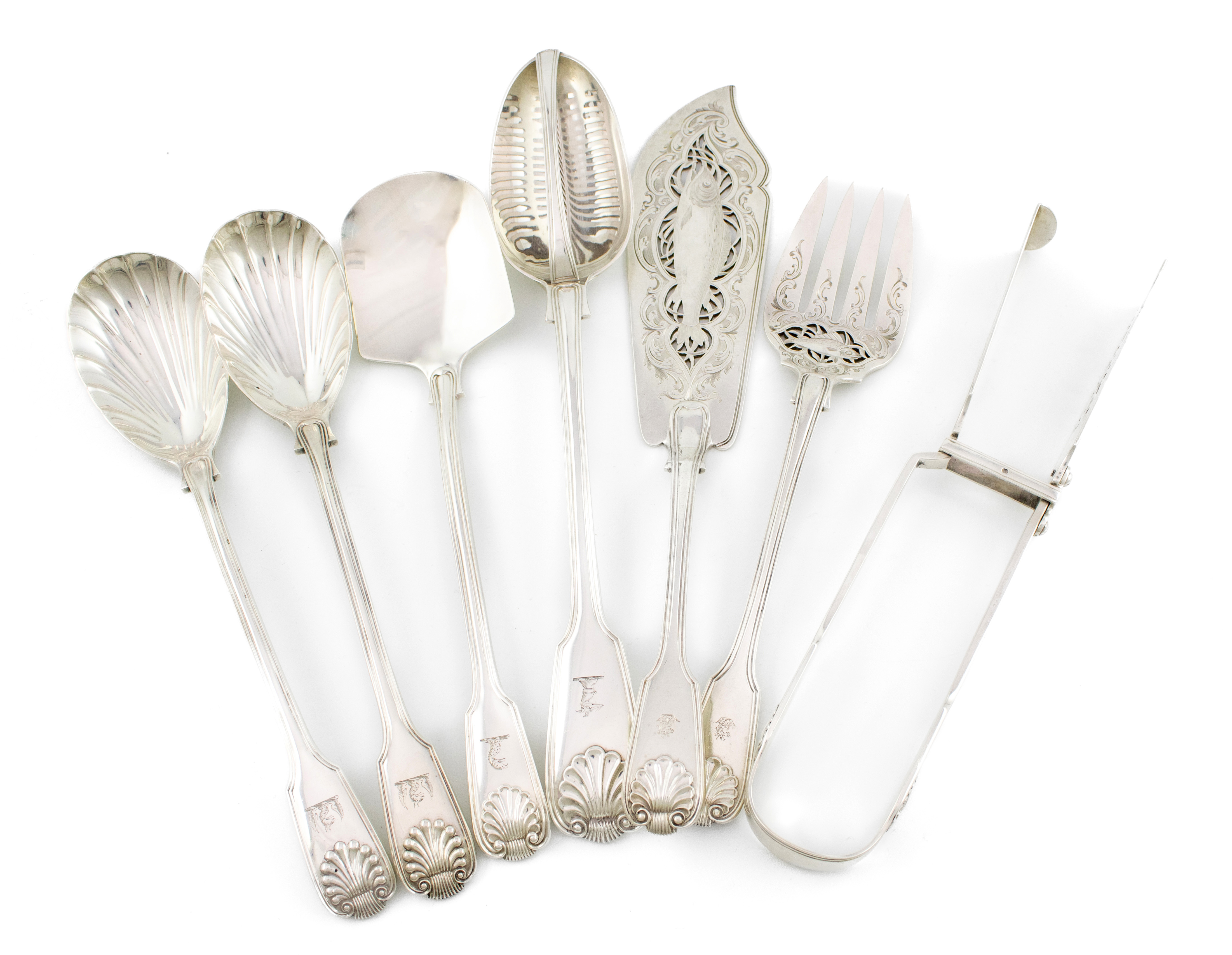 A collection of Victorian silver Thread, Fiddle & Shell serving pieces,