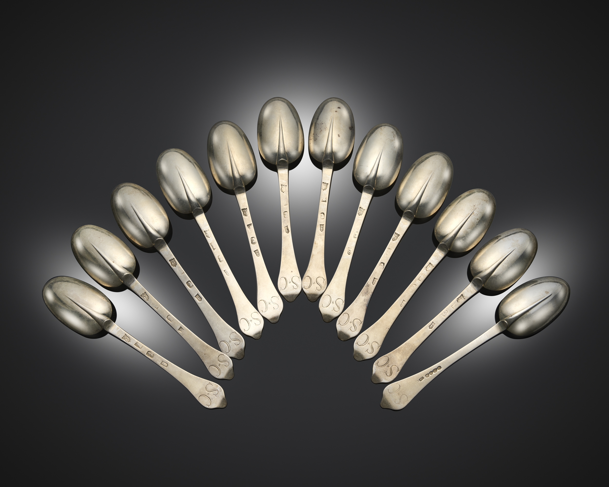 the reverse of the oval bowls with a raised rat-tail, the reverse of the terminals scratch initialled 'S*C', for Sion College, length 20.1cm, approx. weight 22.6oz. (12)