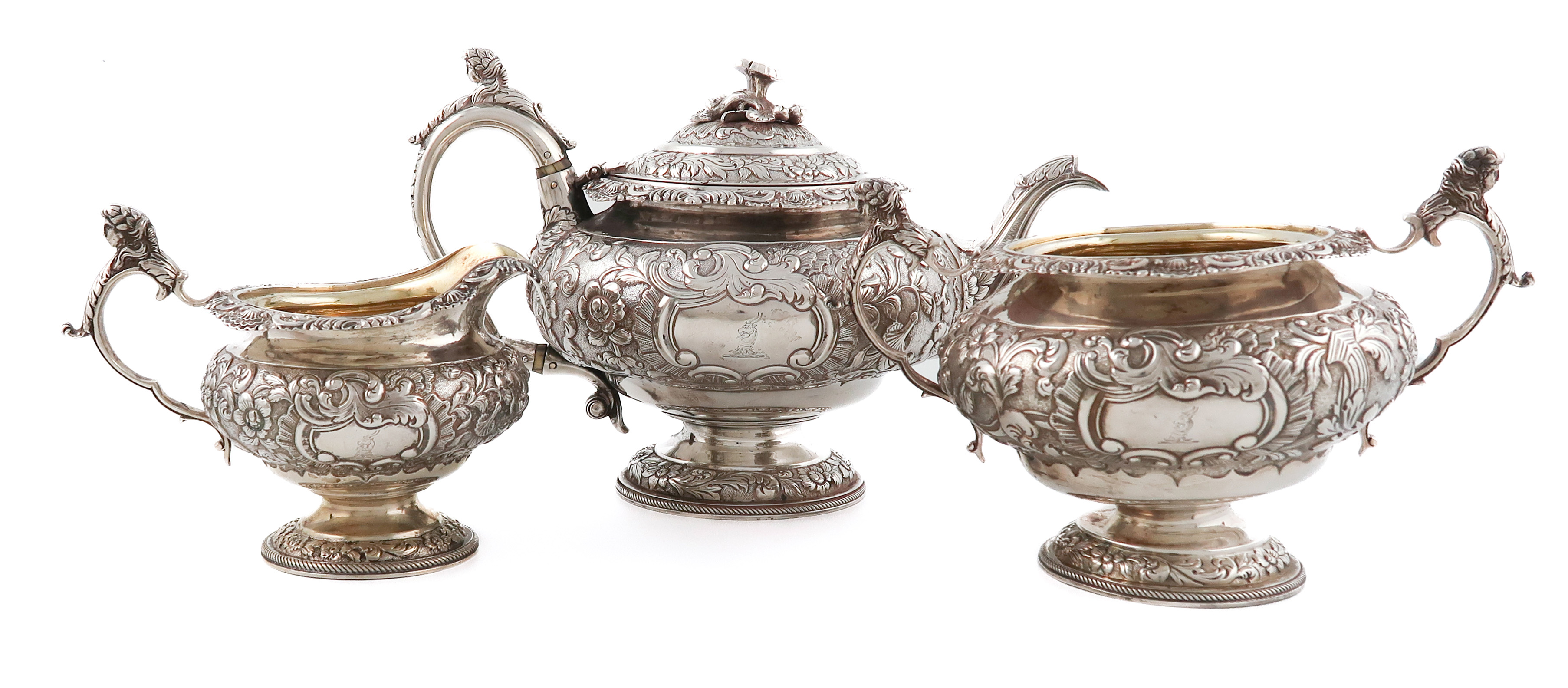 circular form, chased foliate scroll decoration on a matted background, the scroll handles with female masks, the hinged cover with a flower final, on raised circular bases with rope-work borders, length handle to handle 27.5cm, approx. weight 60oz. (3)