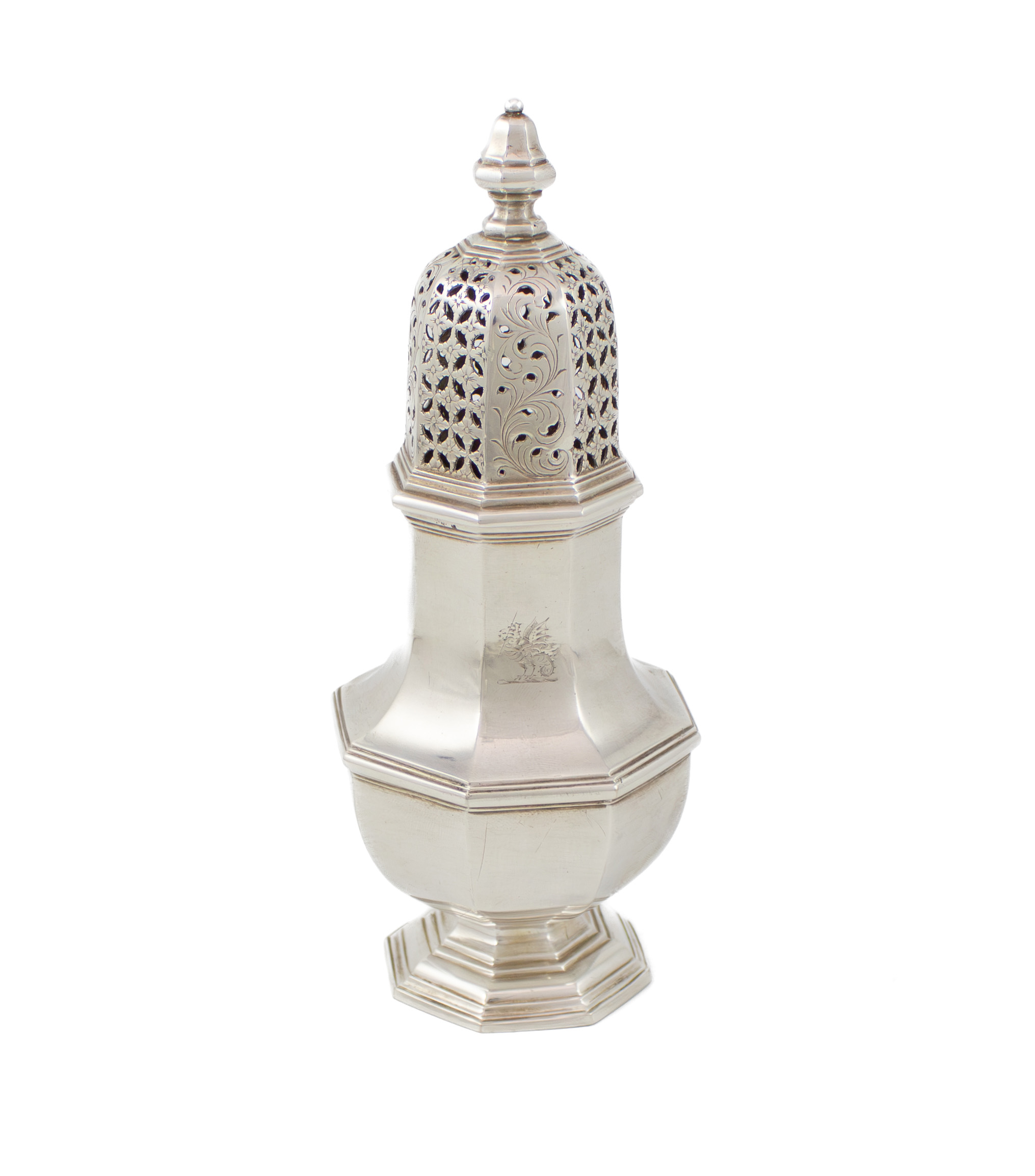 octagonal baluster form, engraved with a crest, the pull-off cover with pierced and engraved decoration and with an octagonal urn finial, height 19.5cm, approx. weight 12.5oz.