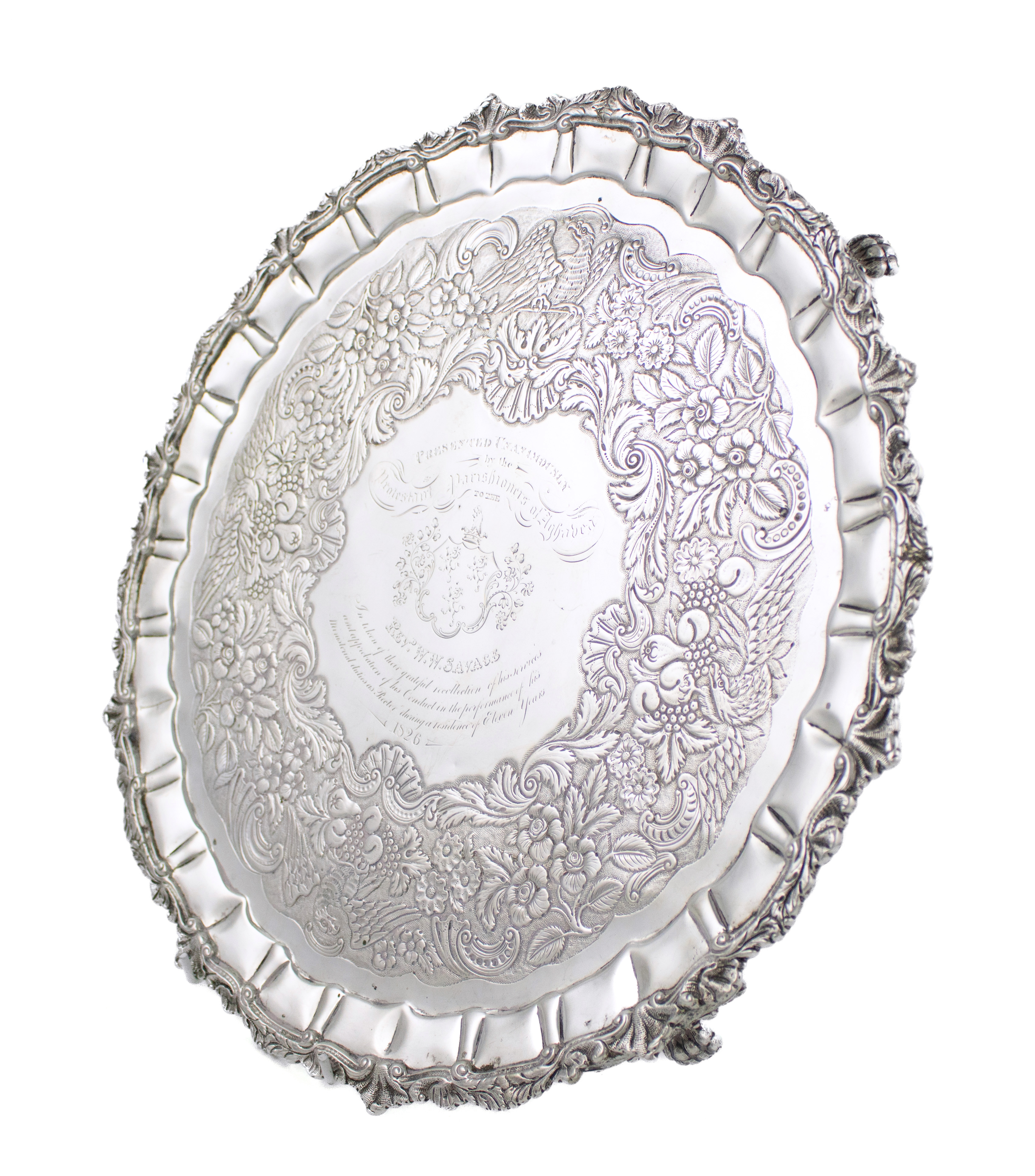 circular form, scroll foliate and shell moulded border, embossed foliate decoration, engraved with armorial and a presentation inscription to the Rev W.W. Savage from his parishioners 1826, on four foliate and paw bracket feet, diameter 36.7cm, approx. weight 39.2oz.