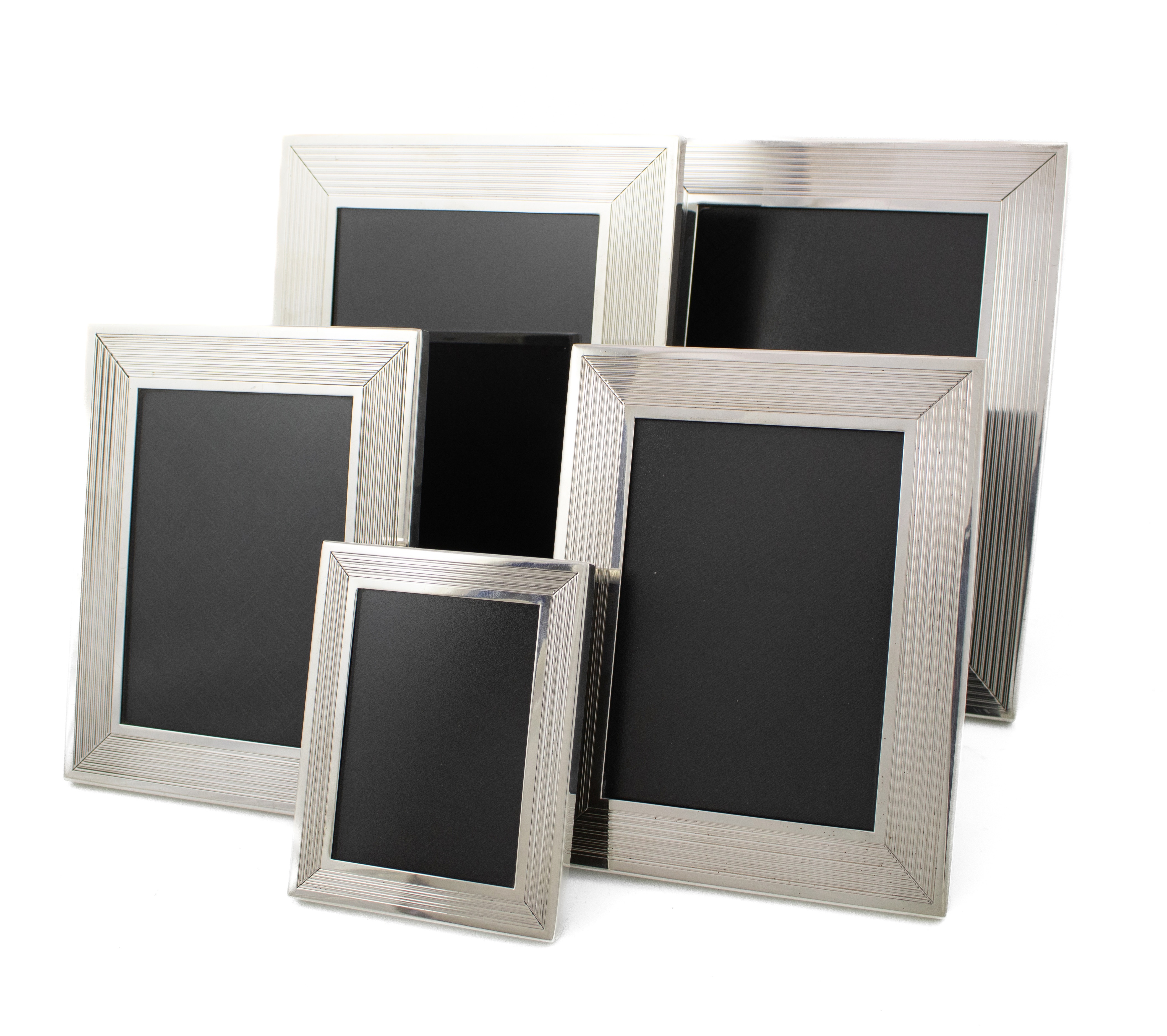 plain rectangular form with reeded decoration, material covered easel backs, height of largest 23cm, height of smallest 11.9cm. (5)
