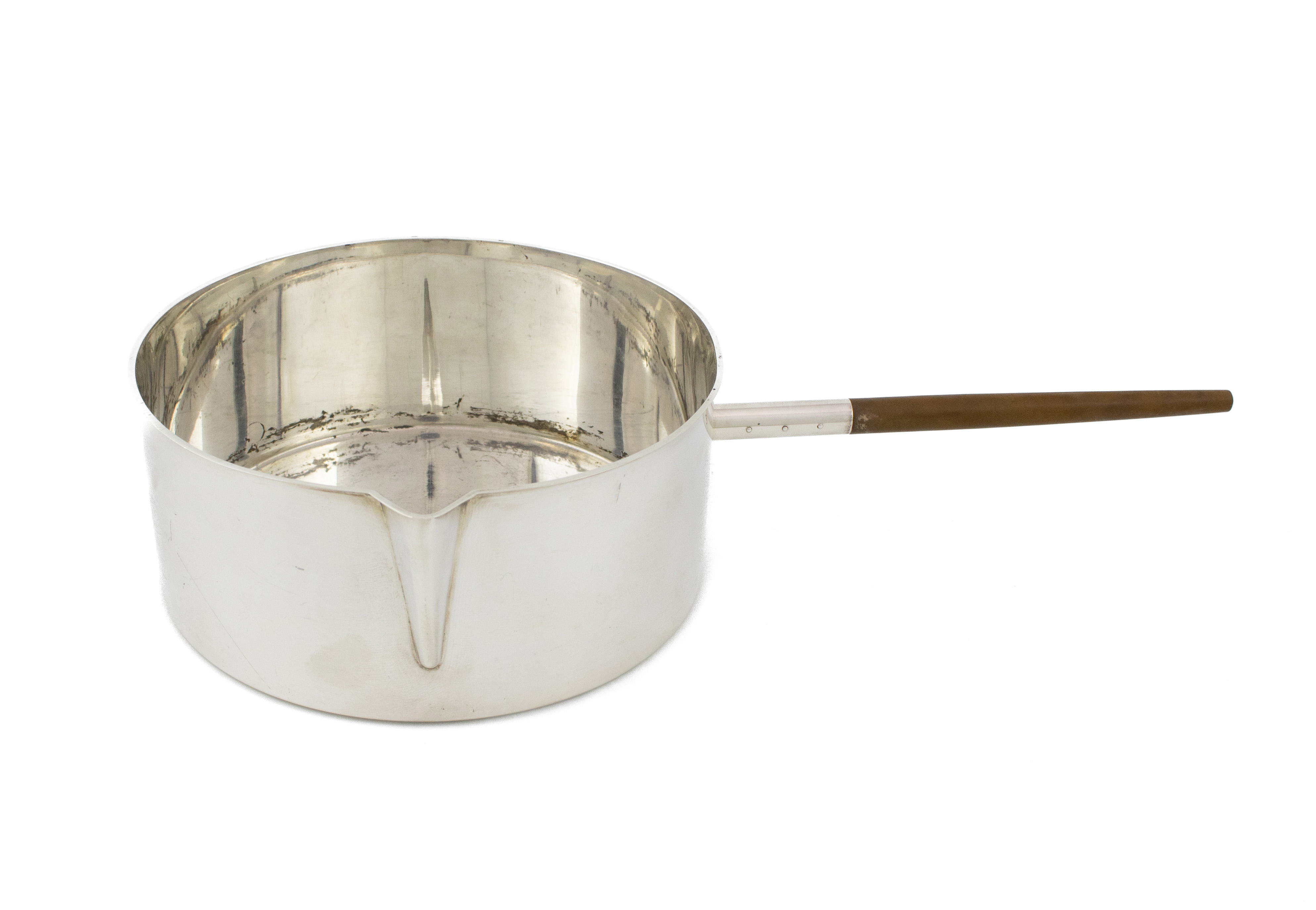 circular form, tapering side handle, length 32.3cm, approx. weight 18oz.