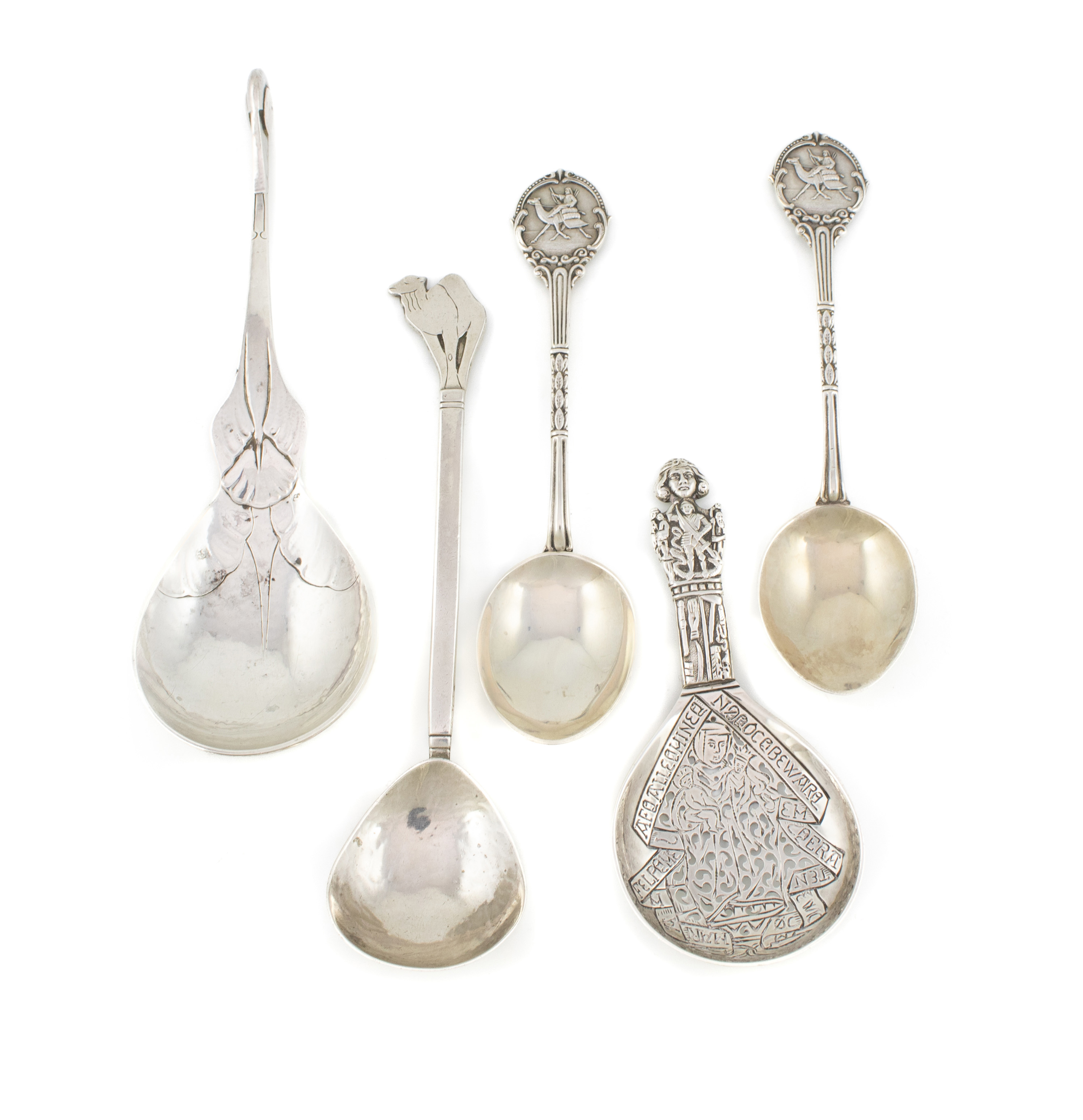 plus a pair of souvenir Khartoum Rifle Club spoons by J A Wylie & Co, Birmingham 1929, a stylised spoon with a camel terminal and a copy of an early Scandinavian spoon, total approx. weight 8.4oz. (5)