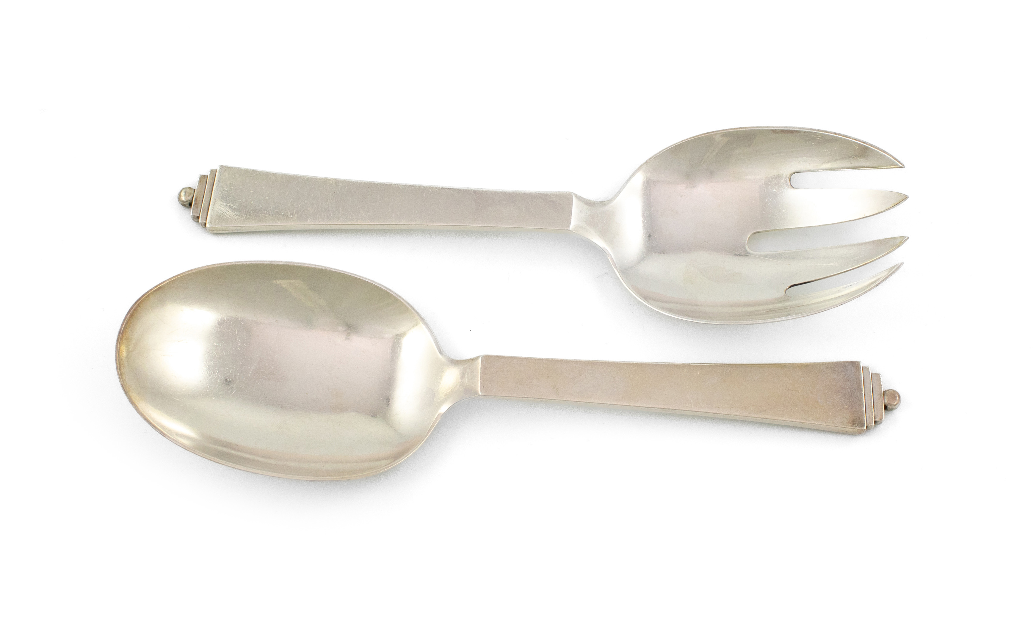 Designed by Harald Nielsen for Georg Jensen, a matched pair of Danish silver Pyramid pattern salad servers,