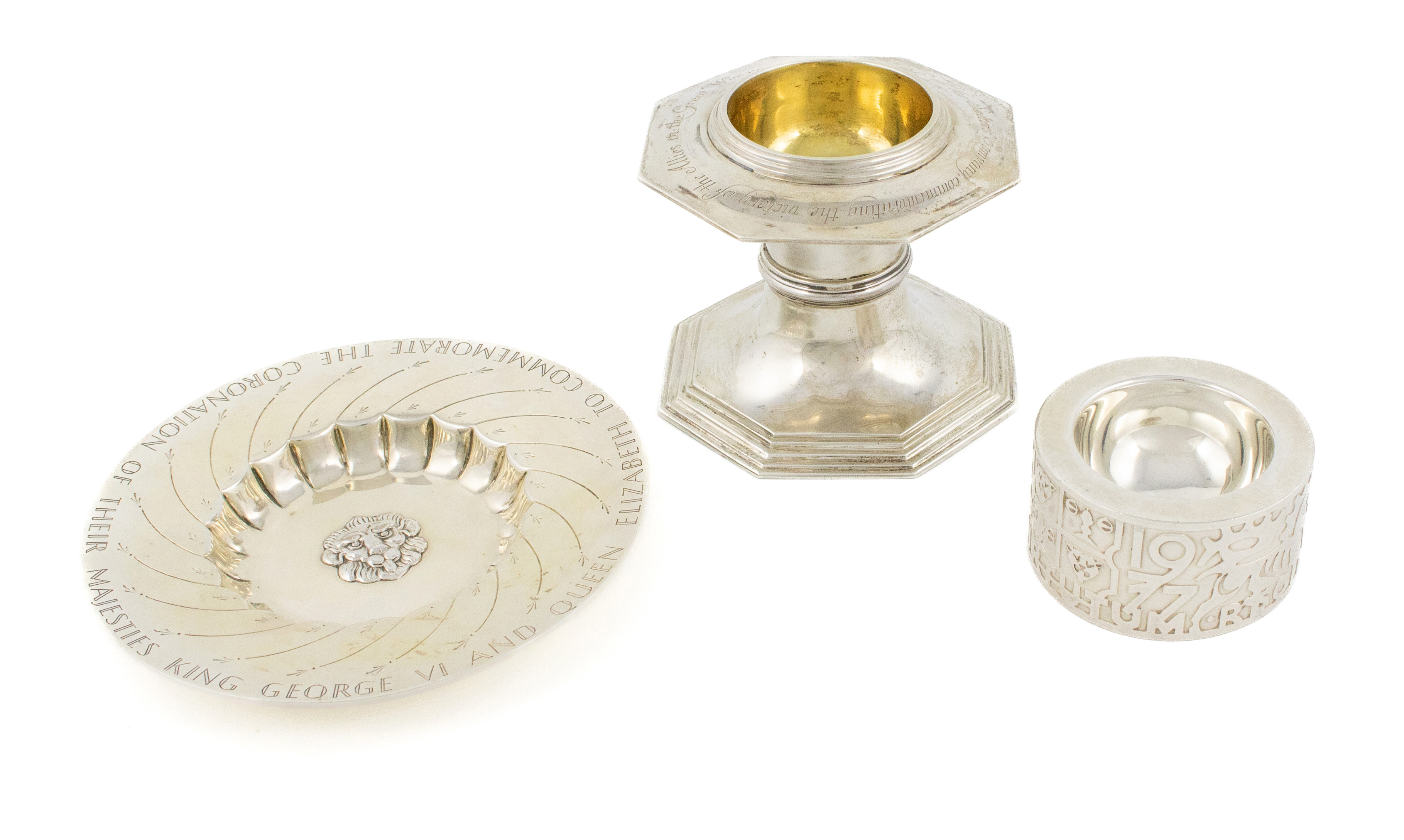 raised octagonal form, with a central gilded bowl, inscribed 'The Gift of the Salters' Company, commemorating the victory of the Allies in the Great War 1914-1918', with an engraved armorial above the stepped base, plus a George VI commemorative coronation dish and a silver salt designed by Alex Styles for the 650th anniversary of the Goldsmiths, London 1977, total approx. weight 14.9oz. (3)