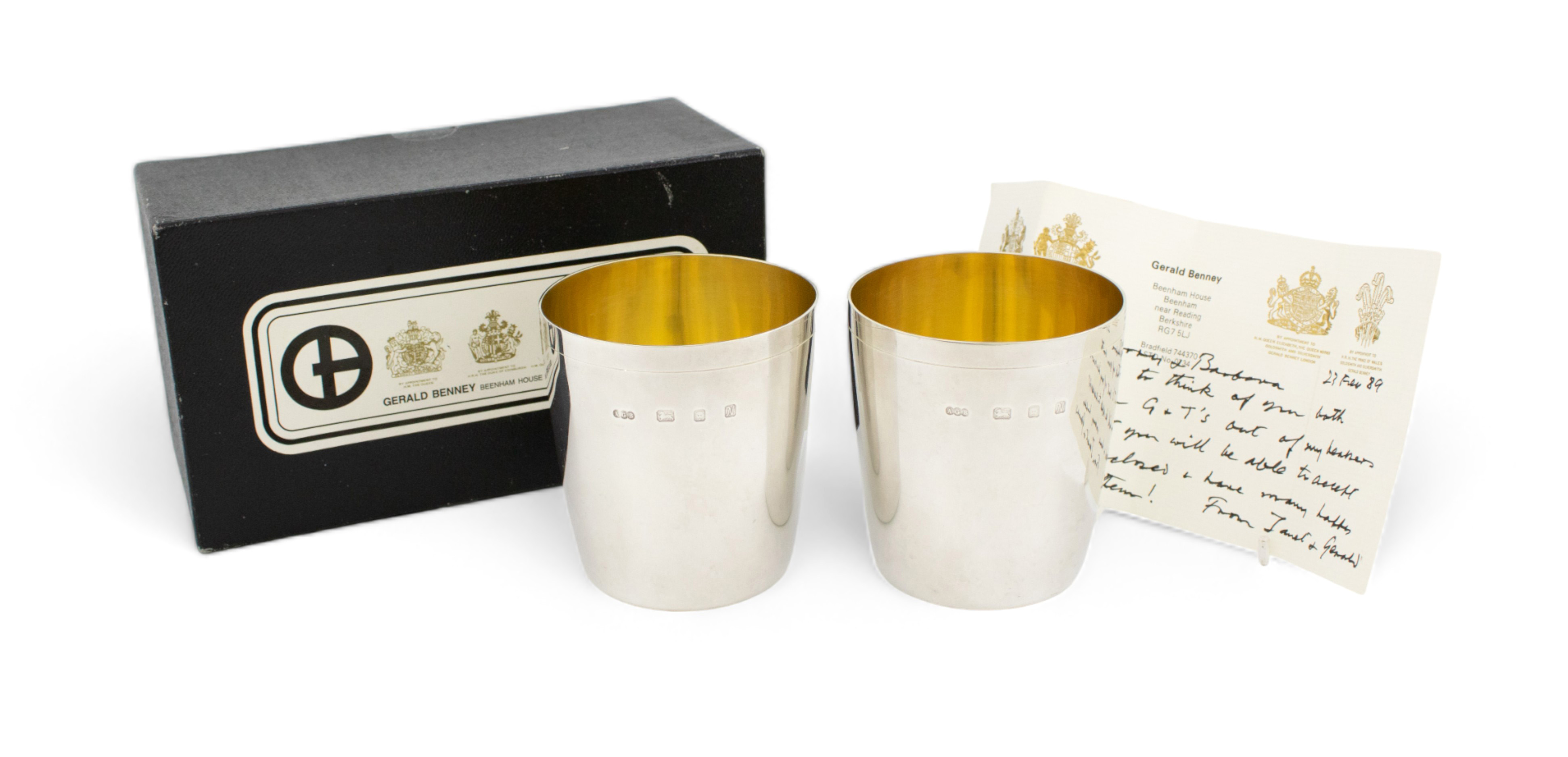 The note handwritten from Gerald Benney, 23 Feb 1989, 'Dear Harry and Barbara, I would like to think of you both drinking your G & T's out of my beakers so I hope that you will be able to accept the enclosed and have many happy hours raising them! From Janet and Gerald'.