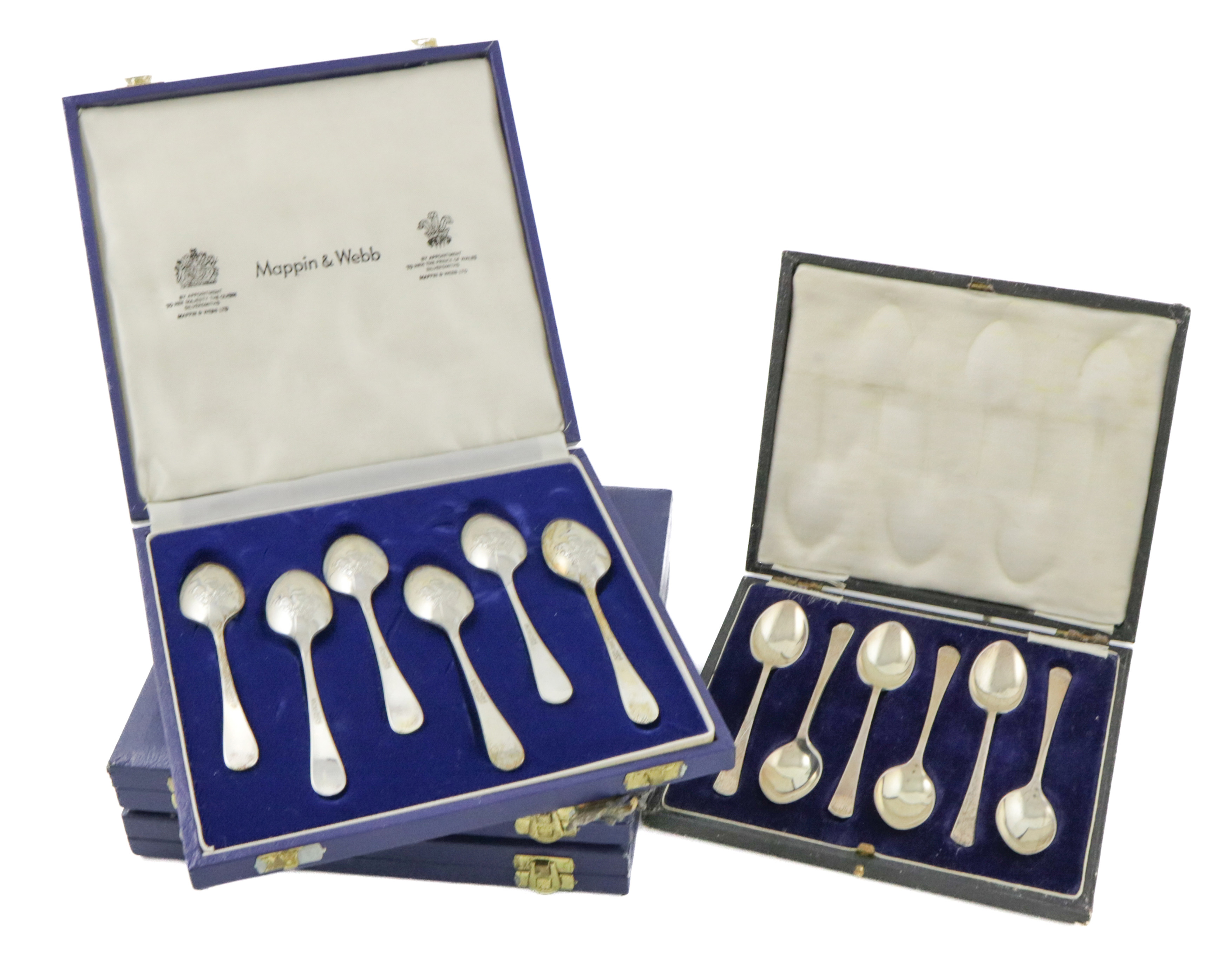 Four cased sets of six silver teaspoons,