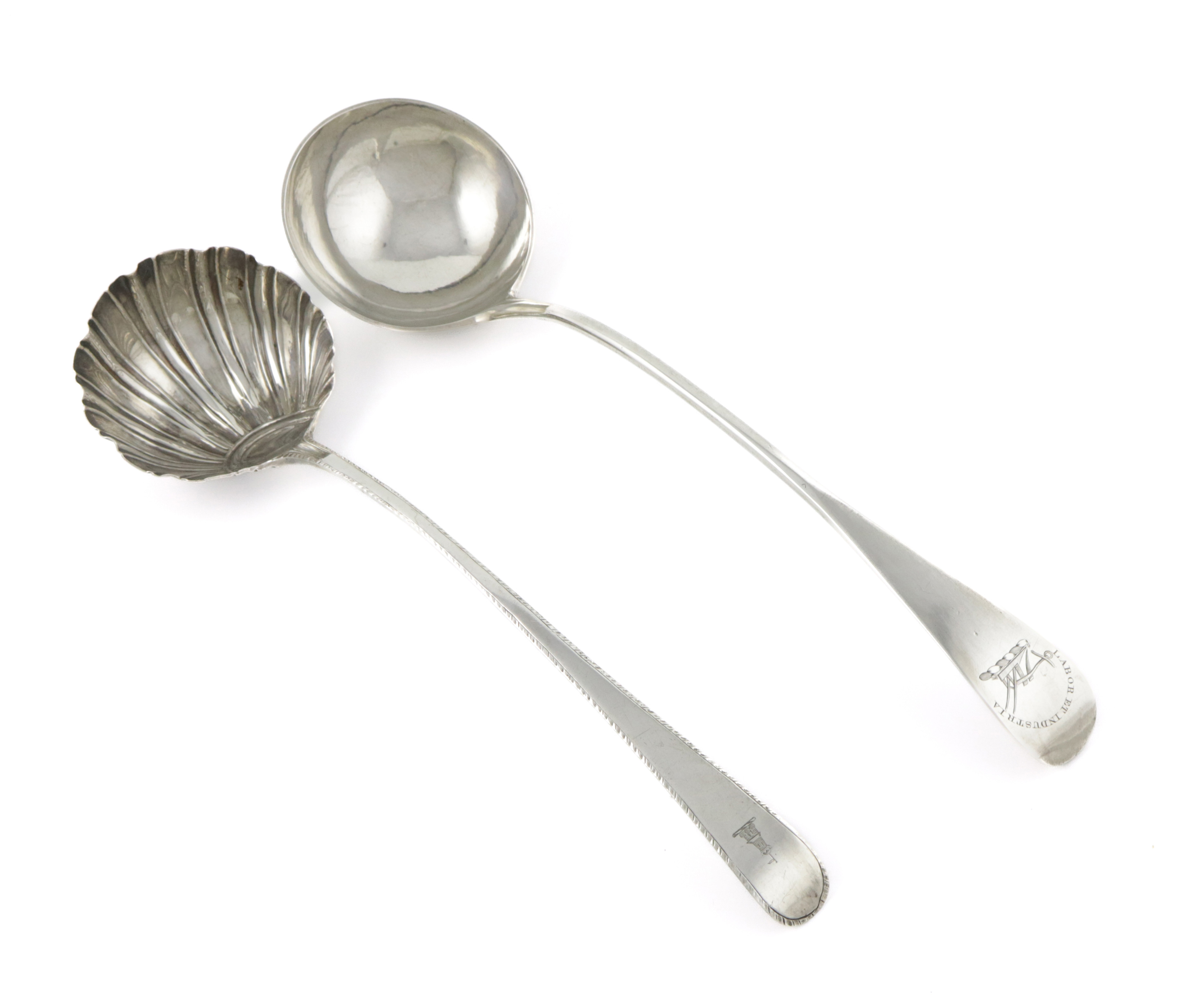 engraved with the crest of Tane and inscribed 'LABOR ET INDUSTRIA' to the terminal, length 37cm, together with a George III silver soup ladle, by Robert Ross, London 1774, with feather-edge and engraved with the crest of Almack, Arnett, Both and others to the terminal, with a moulded bowl, total approx. weight 12.7oz. (2)