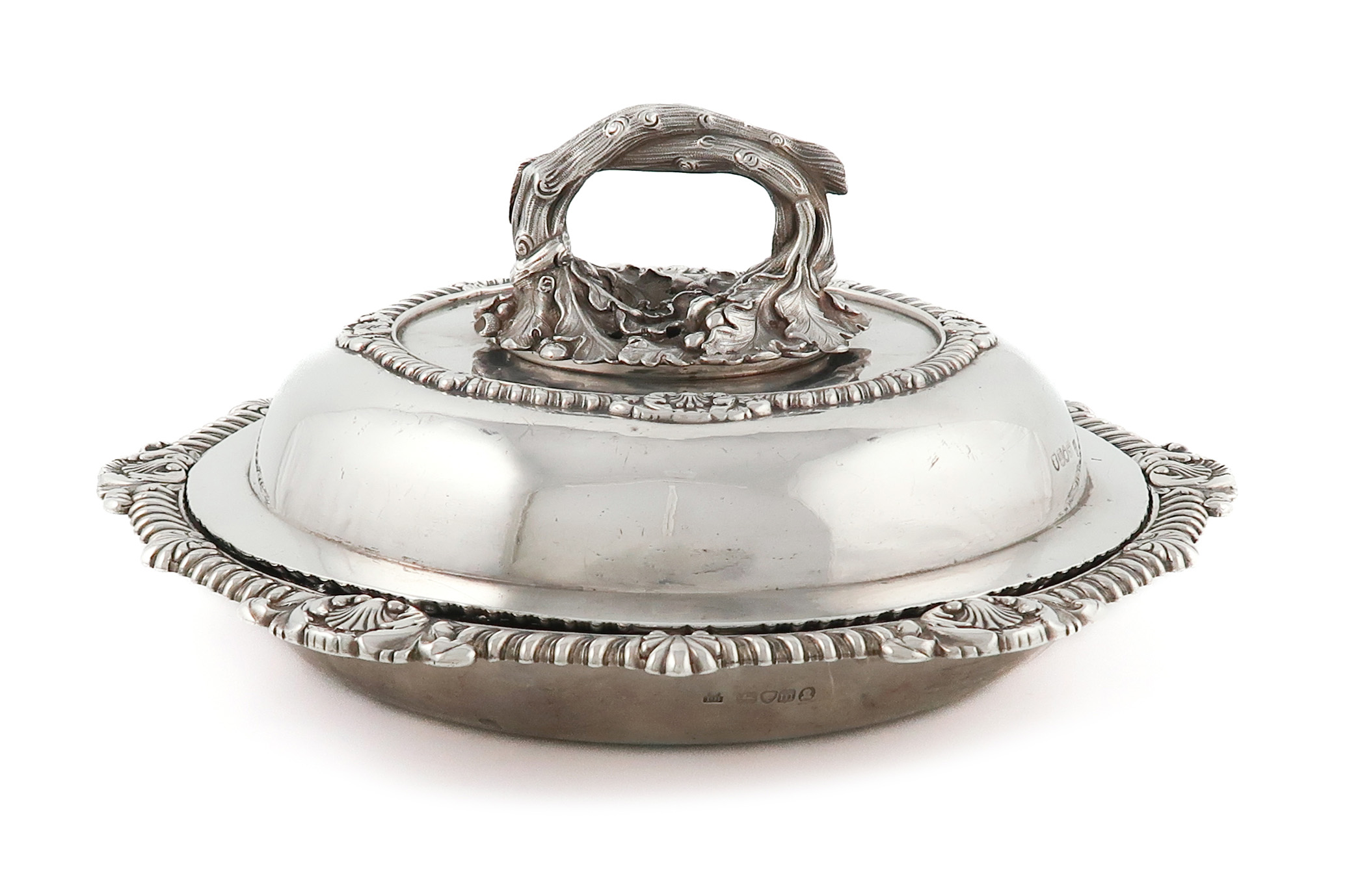 circular form, shell scroll foliate and gadrooned borders, with an acorn and oak leaf formed handle, diameter 28.2cm, approx. weight 60.4oz.