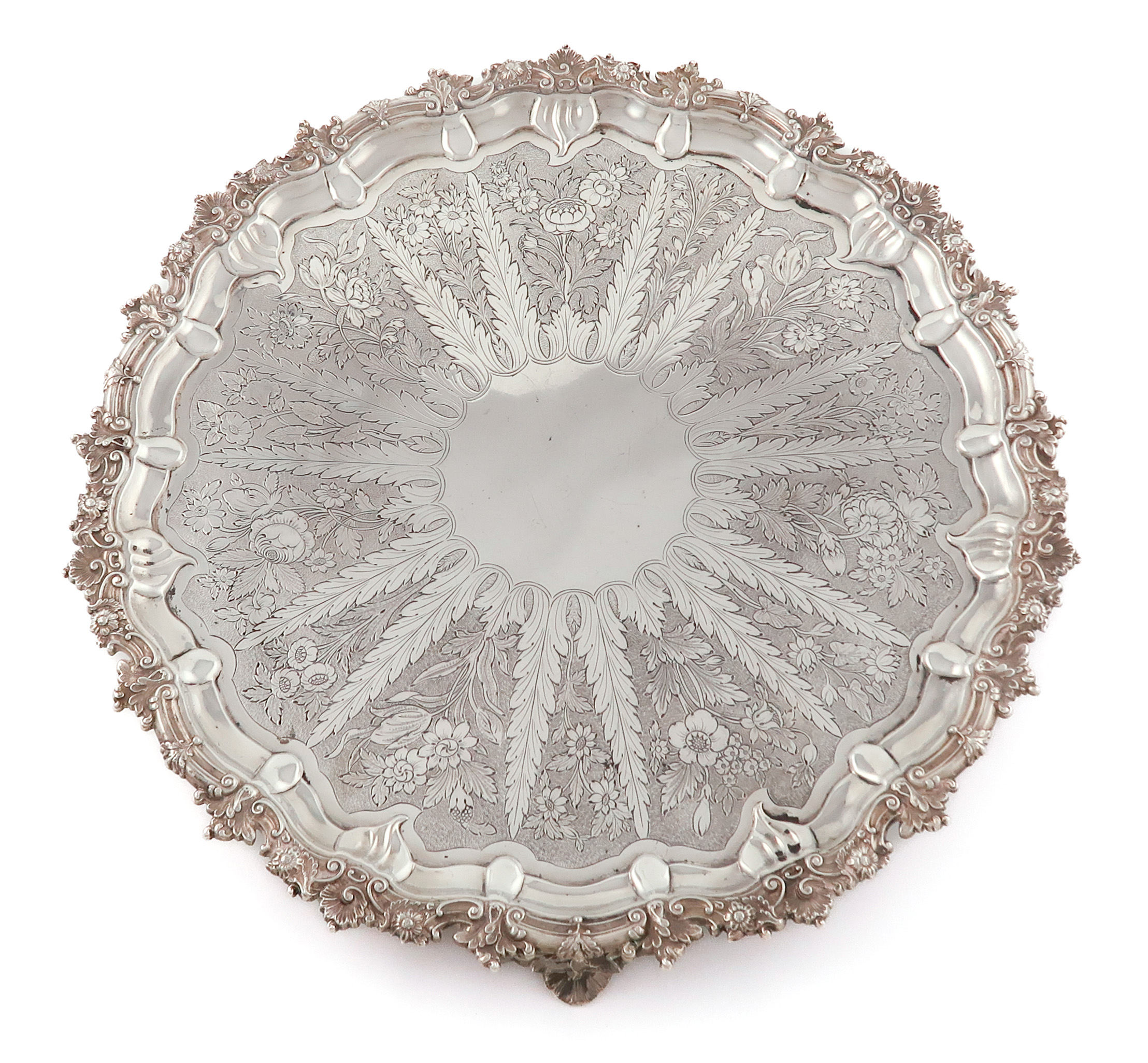 circular form, engraved foliate decoration, with a foliate and shell border, on four floral bracket feet, diameter 42cm, approx. weight 71.3oz.