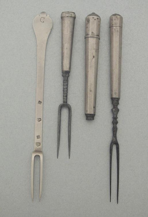 An early 18th century mounted steel two-prong fork, the removable octagonal handle with detachable end cap, another similar handle only, a small cannon handled two prong steel fork, with worn maker's mark. (3)