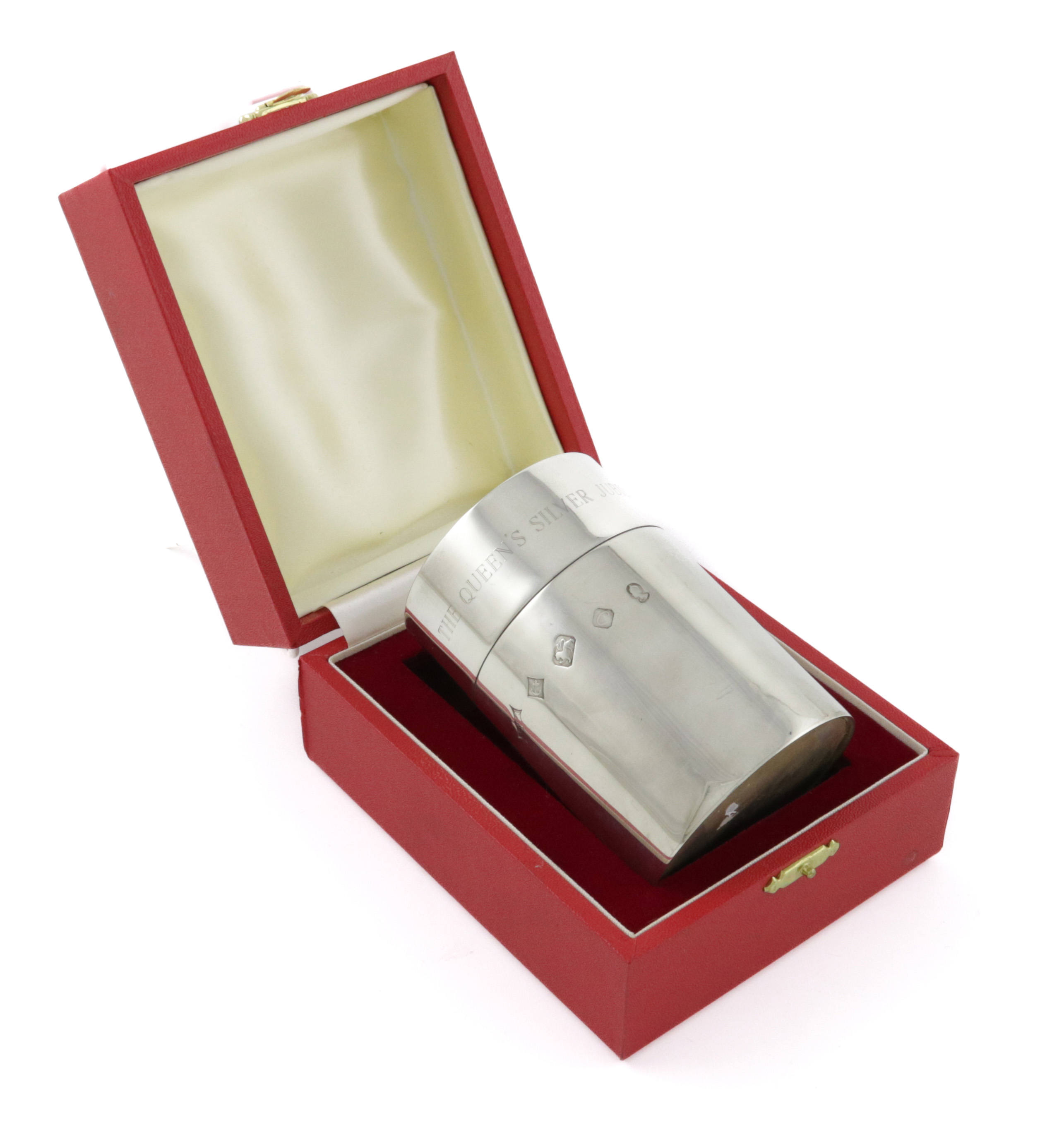 cylindrical form, with the Royal Standard on the cover, inscribed 'THE QUEEN'S SILVER JUBILEE 1952-1977' to the cover, with a fitted case, height 10.1cm, approx. weight 7.2oz.