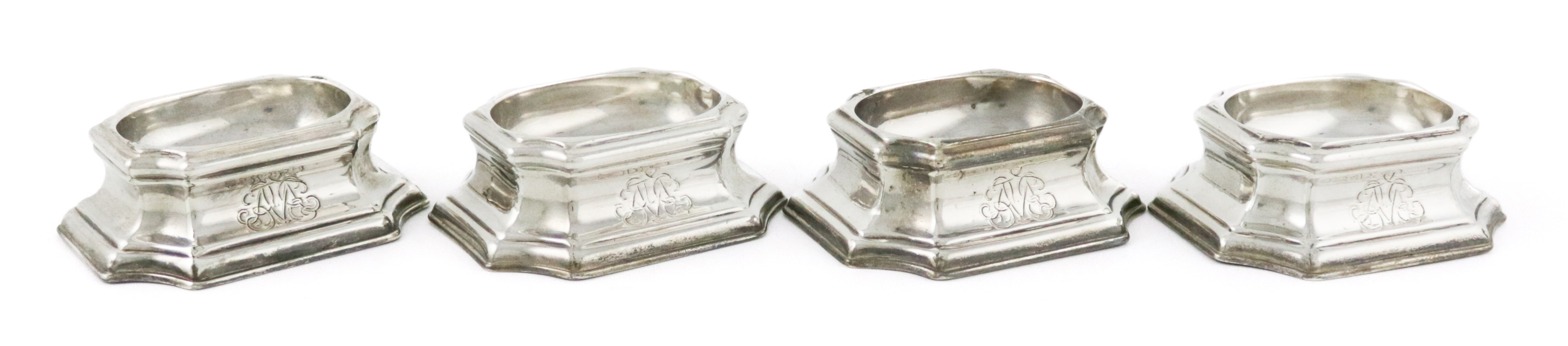 rectangular trencher form, incurved corners, with engraved initials, length 7.7cm, approx. total weight 8.7oz. (4)