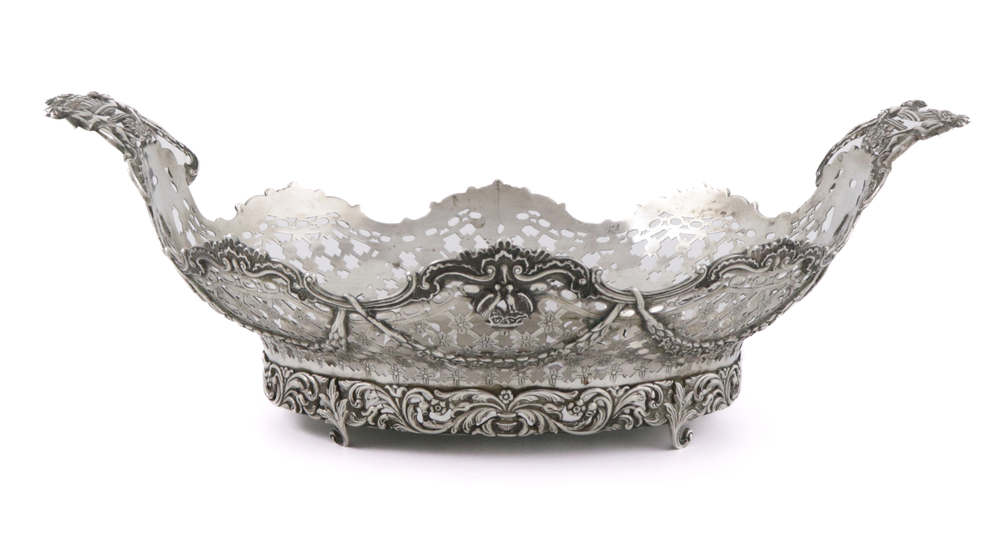 shaped oval form, pierced body decorated with floral swags, scroll and foliate borders, with handles in the form of cherubs and bouquets, on four scroll bracket feet, length handle to handle 41cm, approx. weight 36.4oz.