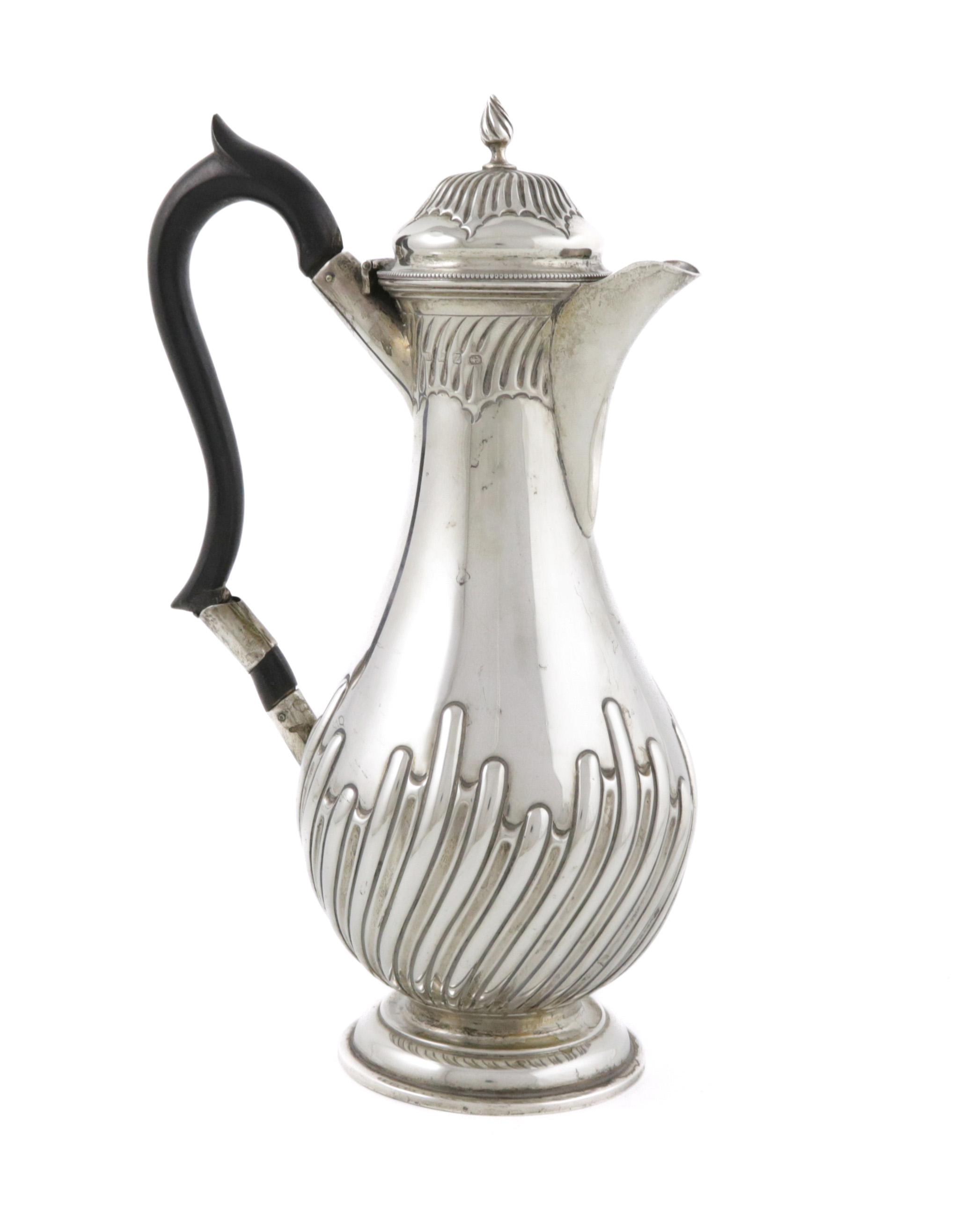 baluster form, part fluted decoration, scroll handle a.f., hinged cover with flame finial, on a raised circular foot, height 25.2cm, approx. weight 14oz.