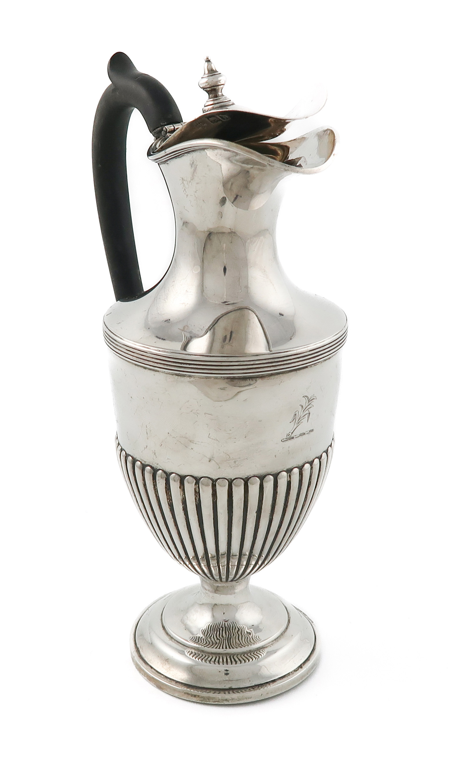 vase form, scroll handle, reeded and part fluted decoration, with an engraved crest, a domed hinged cover with knop finial, on a raised circular foot, height 23.3cm, approx. weight 14.1oz.