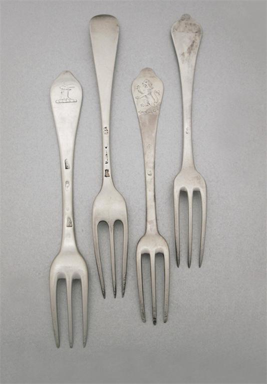 A set of six Queen Anne three-prong table forks, crested, maker Thomas Spackman, London 1704, together with three other prong forks, 16oz. (9)