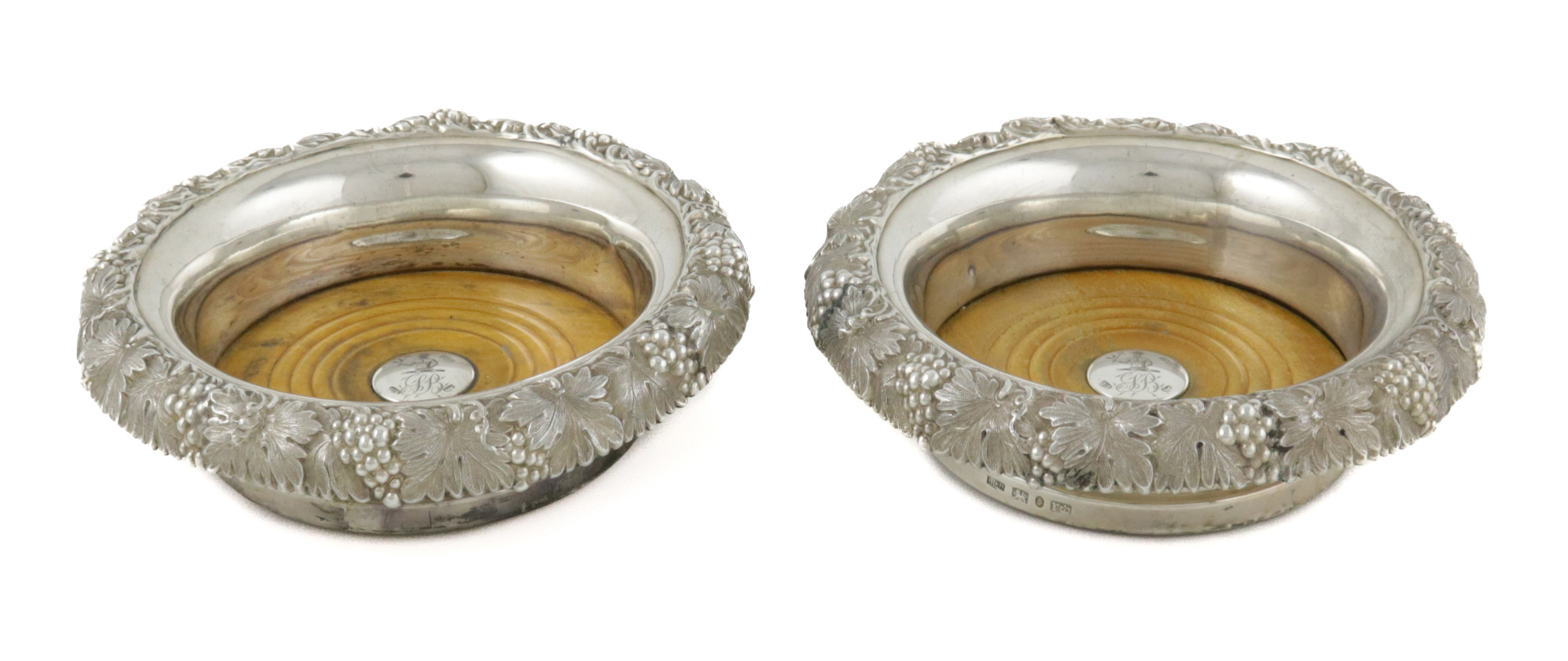 circular form, with a grapevine and grape decorated border, with engraved crest to the central cartouche, diameter 17.3cm. (2)