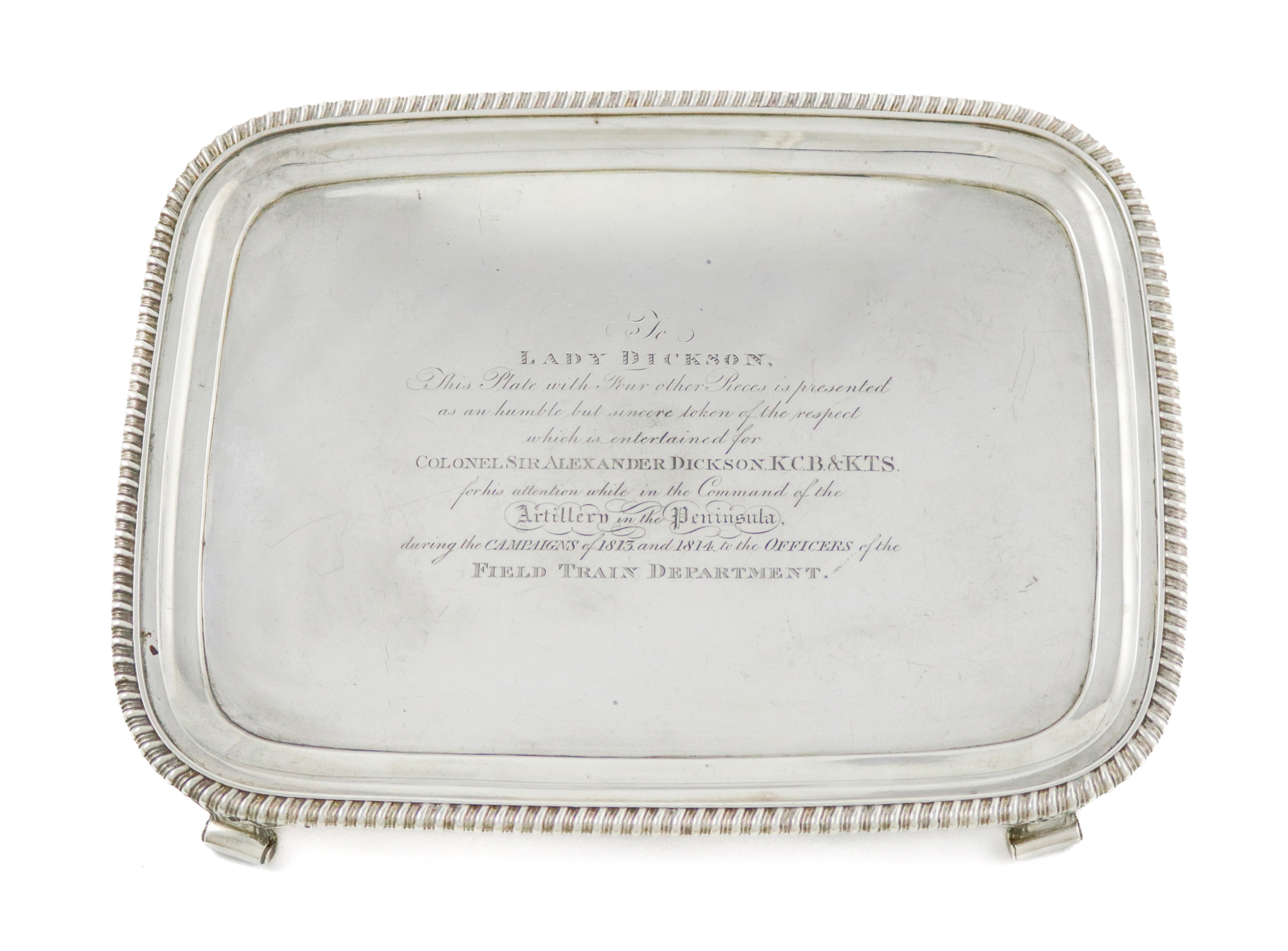 rectangular form, gadrooned border, inscribed 'To LADY DICKSON, This Plate with Four other Pieces is presented as an humble but sincere token of the respect which is entertained for COLONEL SIR ALEXANDER DICKSON. K.C.B & K.T.S. for his attention while in Command of the Artillery in the Peninsula, during the CAMPAIGNS of 1813. and 1814. to the OFFICERS of the FIELD TRAIN DEPARTMENT', on four foliate scroll bracket feet, length 33.7cm, approx. weight 40oz.