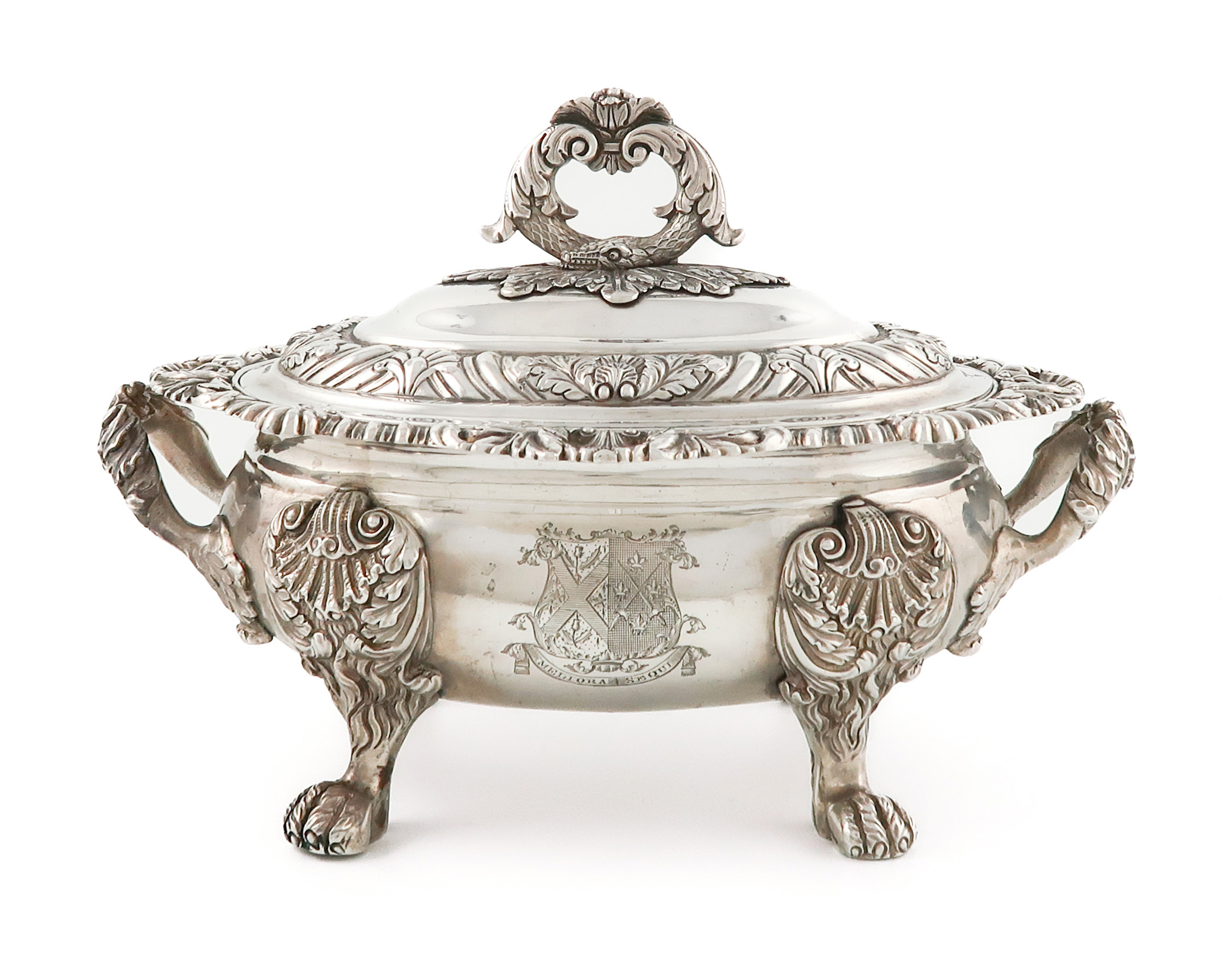 oval form, shell foliate and gadroon borders, foliate and shell scroll handles, the cover with a scroll foliate handle, on four paw and foliate feet, length handle to handle 21.2cm, total approx. weight 34.5oz.