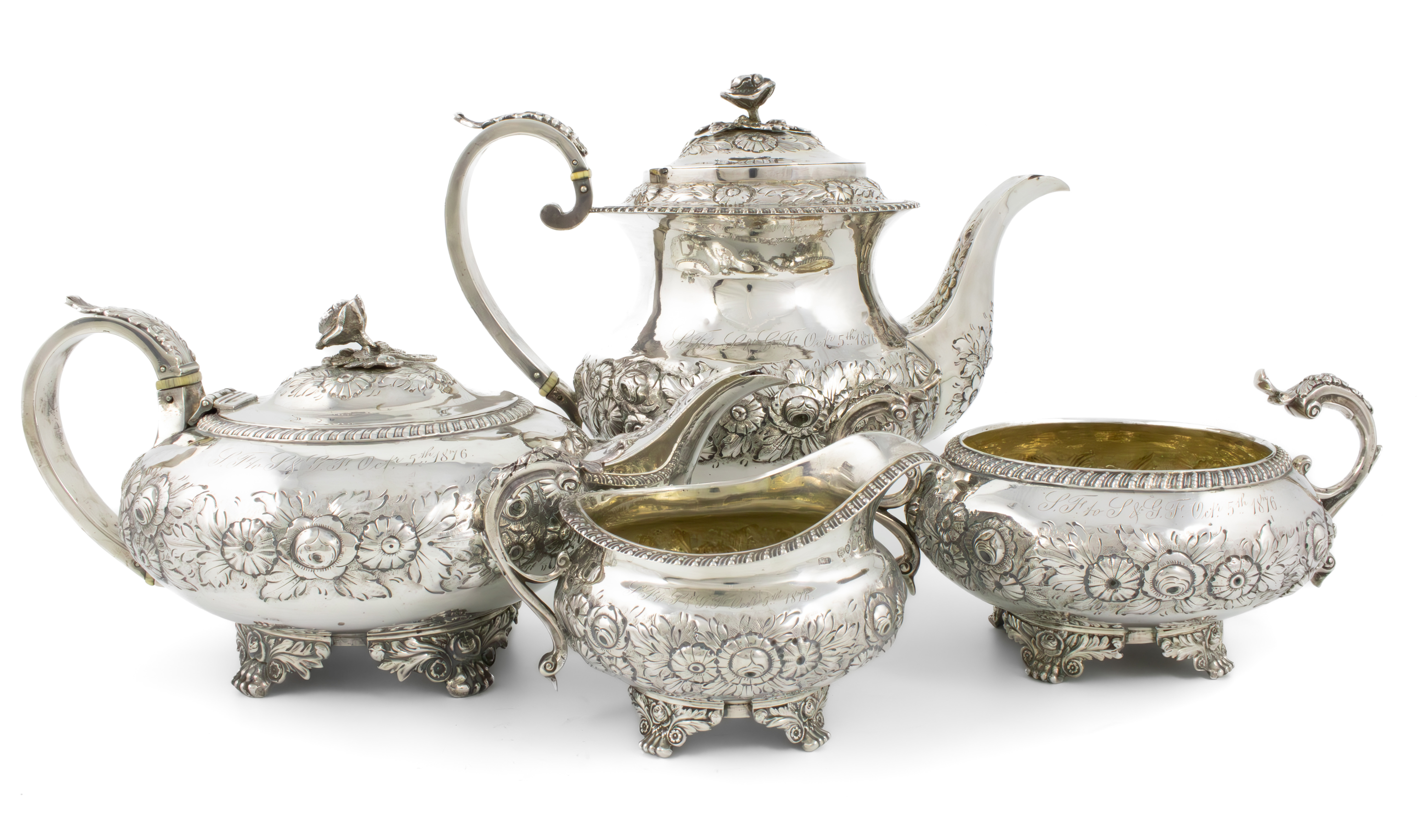 circular baluster form, with beaded and gadrooned borders, embossed with foliate decoration, scroll handles with ivory insulators, domed hinged covers with flower finials, on four foliate and paw bracket feet, the coffee pot on a raised circular foot, height of coffee pot 21.5cm, total approx. weight 78oz. (4)