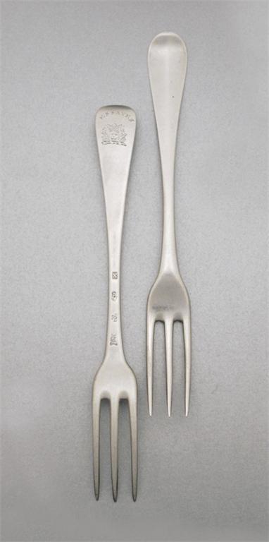 A set of twelve early George II Scottish three-prong table forks, with crest and motto 'ESSAYEZ', maker James Ker, Edinburgh 1727, 24oz. (12)