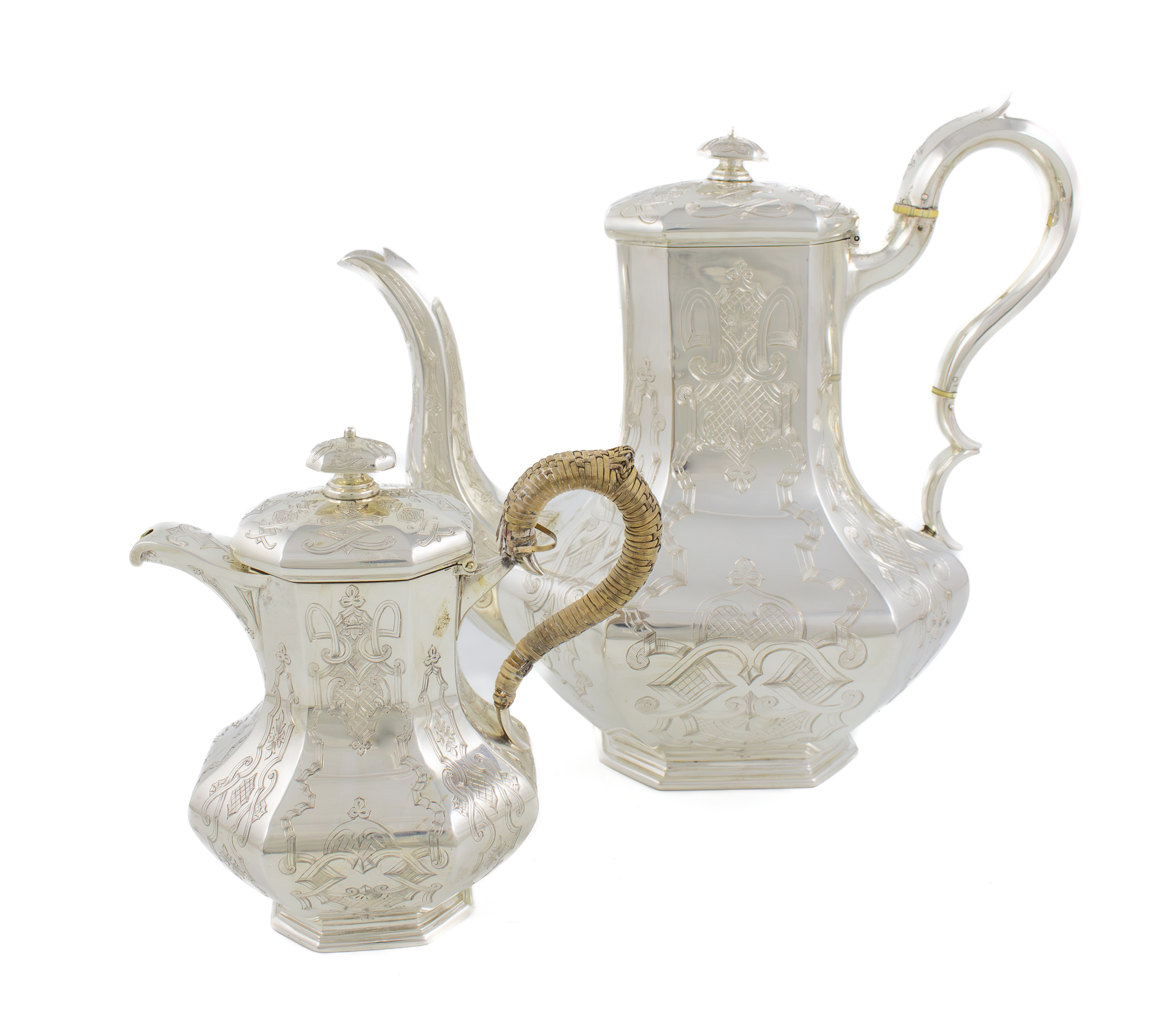 octagonal bellied form, engraved stylised scroll decoration, hinged cover with a knop finial, scroll handle with ivory insulators, wicker bound scroll handle to the hot water pot, on a stepped octagonal base, height 24.2cm, total approx. weight 41.3oz. (2)