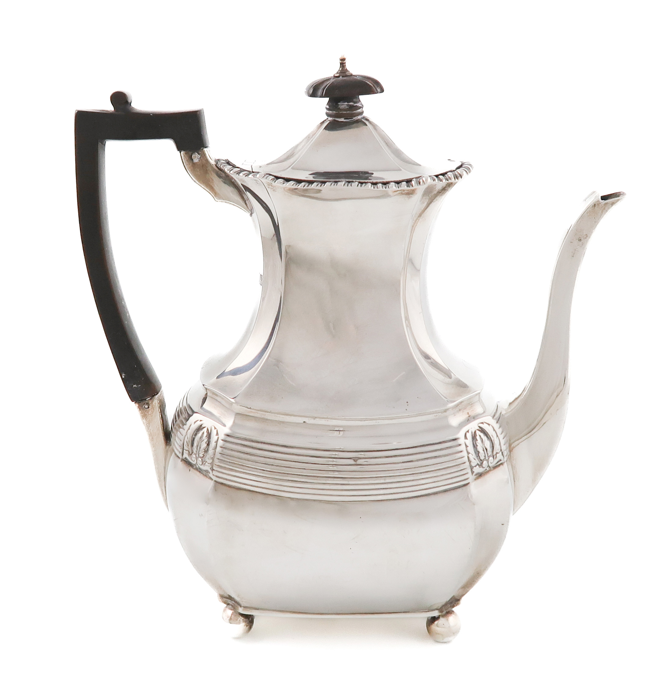 faceted oblong bellied form, a central reeded and foliate band, gadroon border, tapering faceted spout, height 23.5cm, approx. weight 22.4oz.