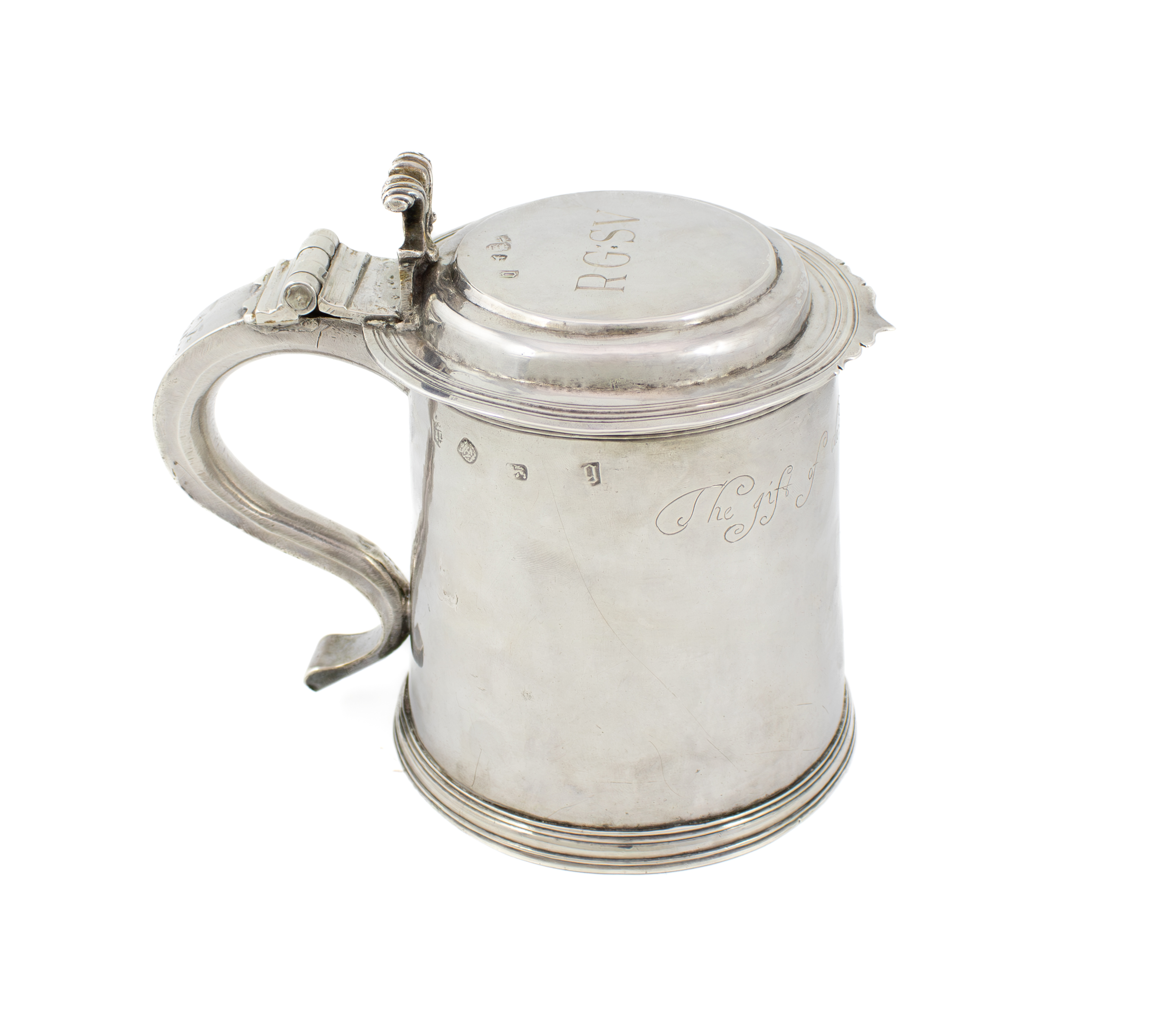tapering circular form, scroll handle with scratched initials 'V over WS', flat hinged cover with a scroll thumb-piece, with an original inscription 'The gift of darathy Hulse to her daughter Suana ban' to the body and later engraved initials to the cover 'RG:SV', on a spread circular foot, height 15.4cm, approx. weight 19.8oz.