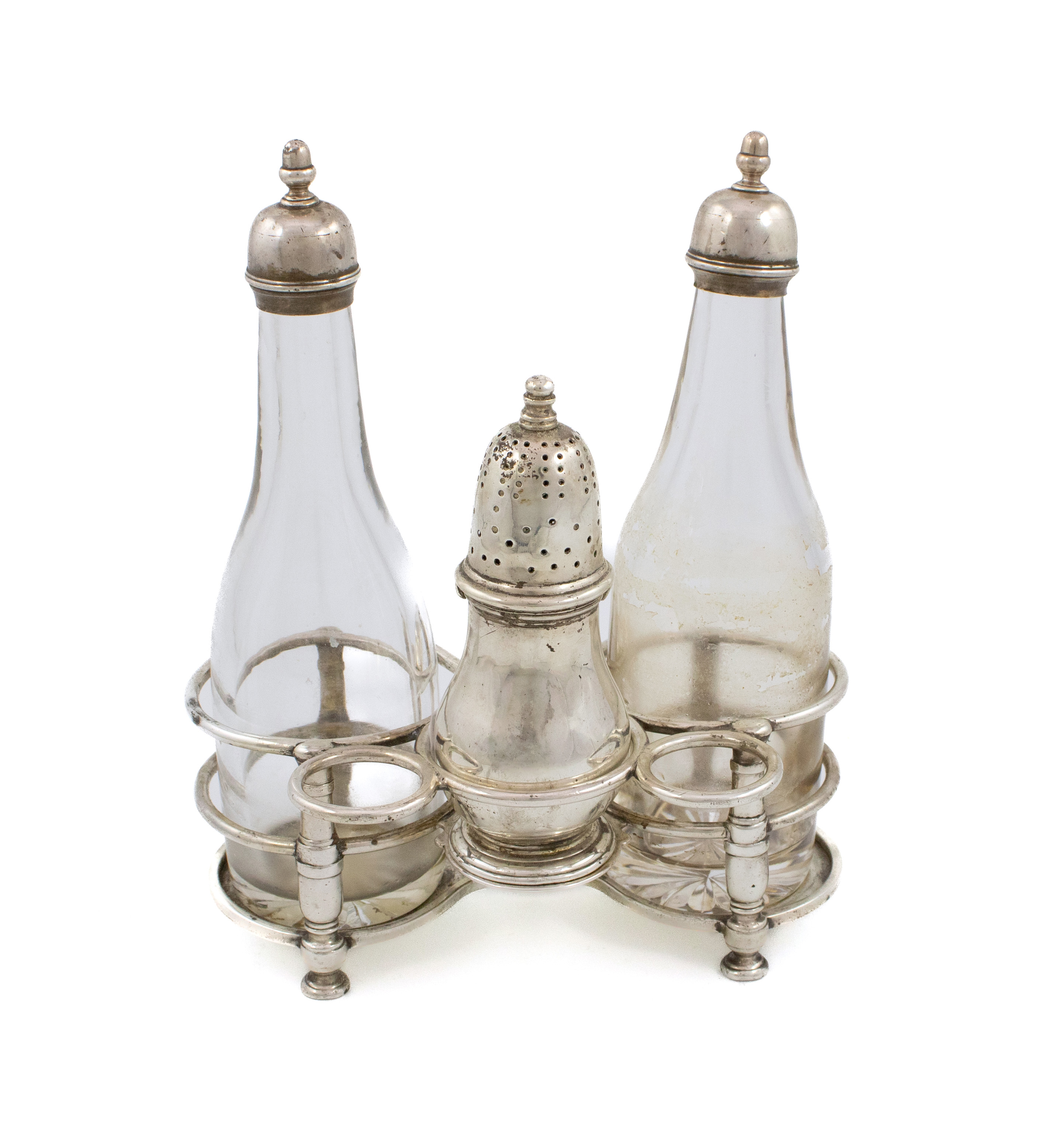 double circular form, wire-work frame and supports for stoppers and pepper pot, scroll handle, on four knop feet, plus two later glass bottles with unmarked tops, and a pepper pot, baluster form, a bayonet fitted pierced cover with knop finial, on a circular foot, stamped with maker's mark to the foot, length 16.1cm, total approx. weight 17.5oz.