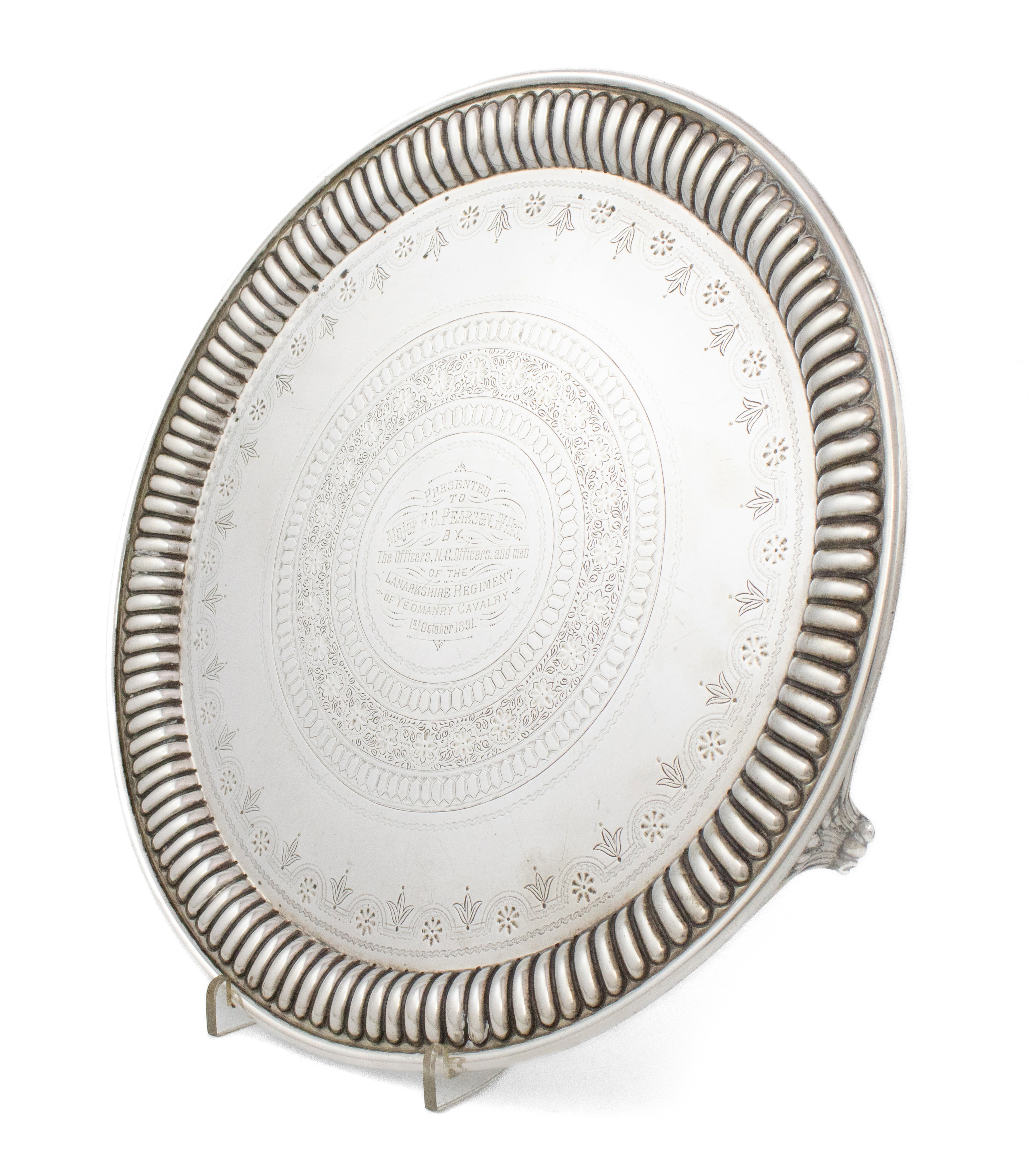 circular form, fluted moulded border, engraved foliate and geometric borders, inscribed ' Presented to Major F.C. Pearson, IV Hrs By The Officers and men of the Lanarkshire Regiment of Yeomanry Cavalry, 1st October 1891', on three scroll bracket feet, diameter 31.4cm, approx. weight 28.4oz.